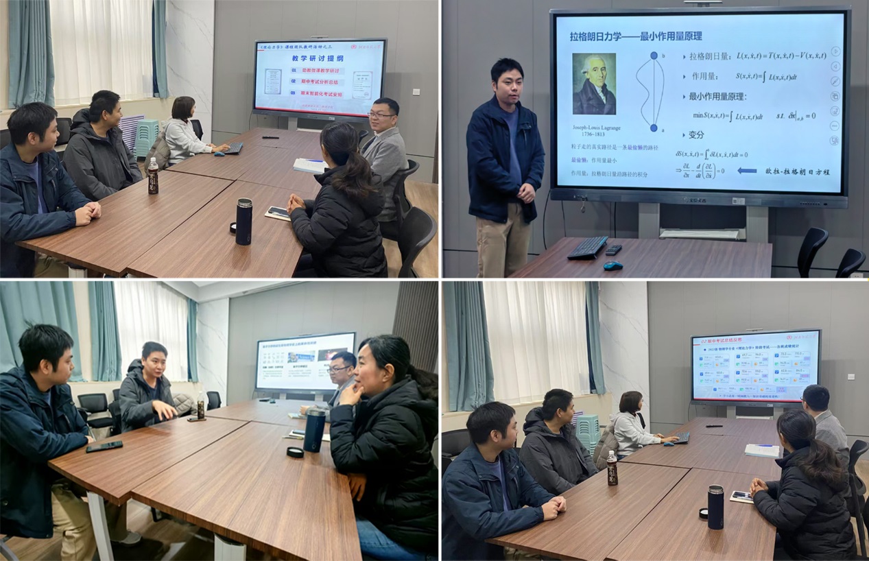 第一,助教微课教学展示。今年新入职的青年博士李可陈老师,本学期担任《理论力学》课程助教,本次他微课教学题目是“从分析力学到量子力学”。首先,他简要地回顾了牛顿力学的理论体系、研究方法、地位作用;然后,他结合物理学史料、科学实验研究、理论创新发展及其应用等,系统地讲述了分析力学的创建背景、发展脉络、理论体系,及其对推进近现代物理学发展和科技创新的重要地位和作用。参会教师肯定了他的精心备课,围绕其教学内容进行了深入交流讨论,详细地对教学设计和方法等提供有益指导和建议。