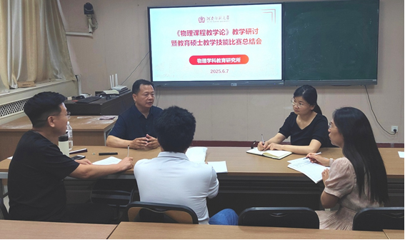 2025年6月7日下午,物理学科教育研究所在物理南楼511教室组织召开《物理课程教学论》教学研讨暨教育硕士教学技能比赛总结会。陈运保、杜爱慧、靳来鹏、陈留定、赵亮五位教师参加了研讨。