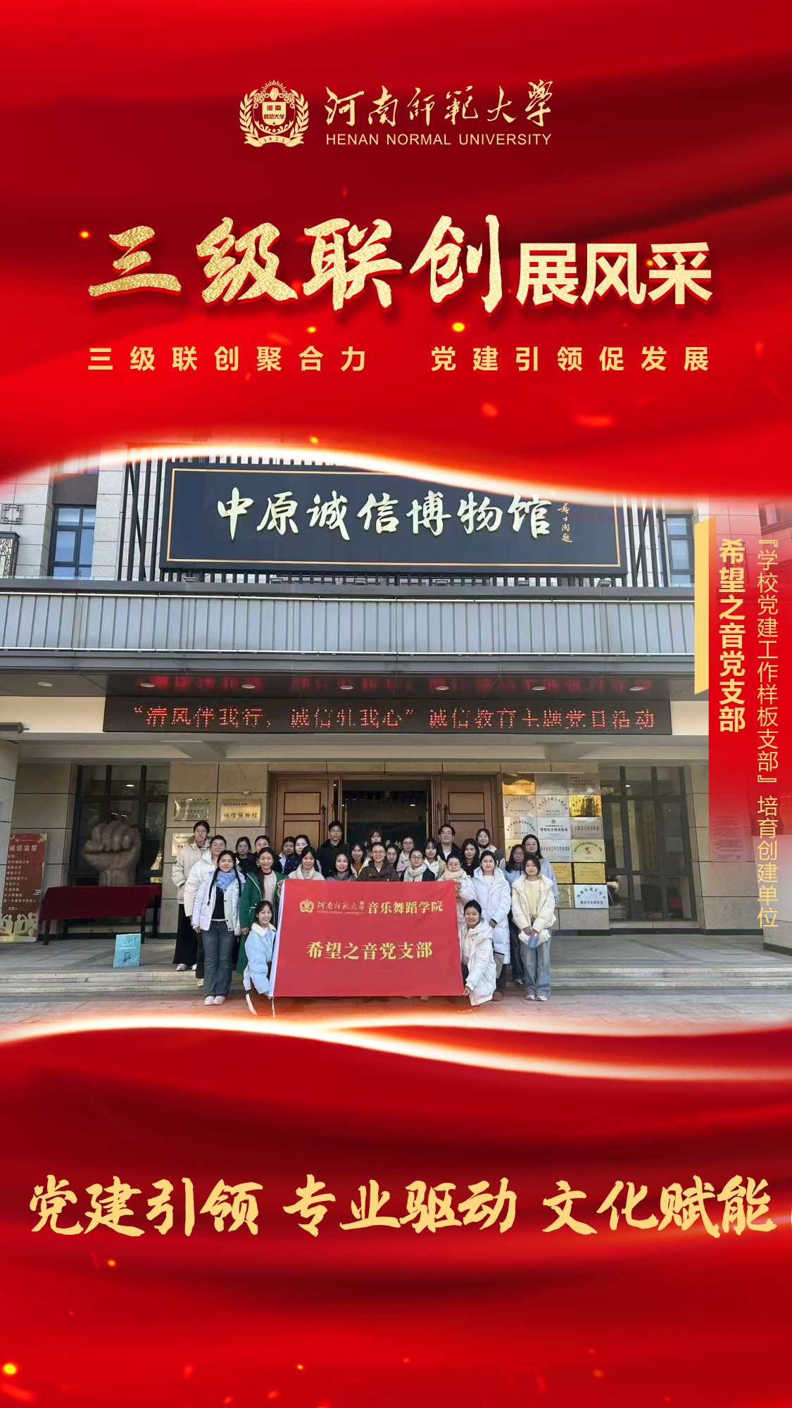 音乐舞蹈学院希望之音党支部始终坚持以党的创新理论武装头脑,以“党建引领、专业驱动、文化赋能”为主线,深入推进“大思政课”与实践育人有机融合,着力打造彰显艺术专业特色的党建品牌,切实将组织优势转化为育人实效。