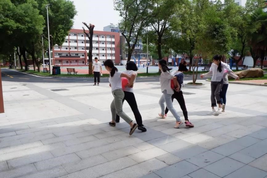 游戏规则:两人依靠背部夹带气球进行50米折返跑。