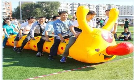游戏规则:比赛开始前,8名队员跨骑在比赛器材上,双手握住固定把手立于起跑线后。裁判发令后,8名队员通过协作配合使比赛器材在跑道上行进,赛程30米,到达折返点绕桩进行折返。