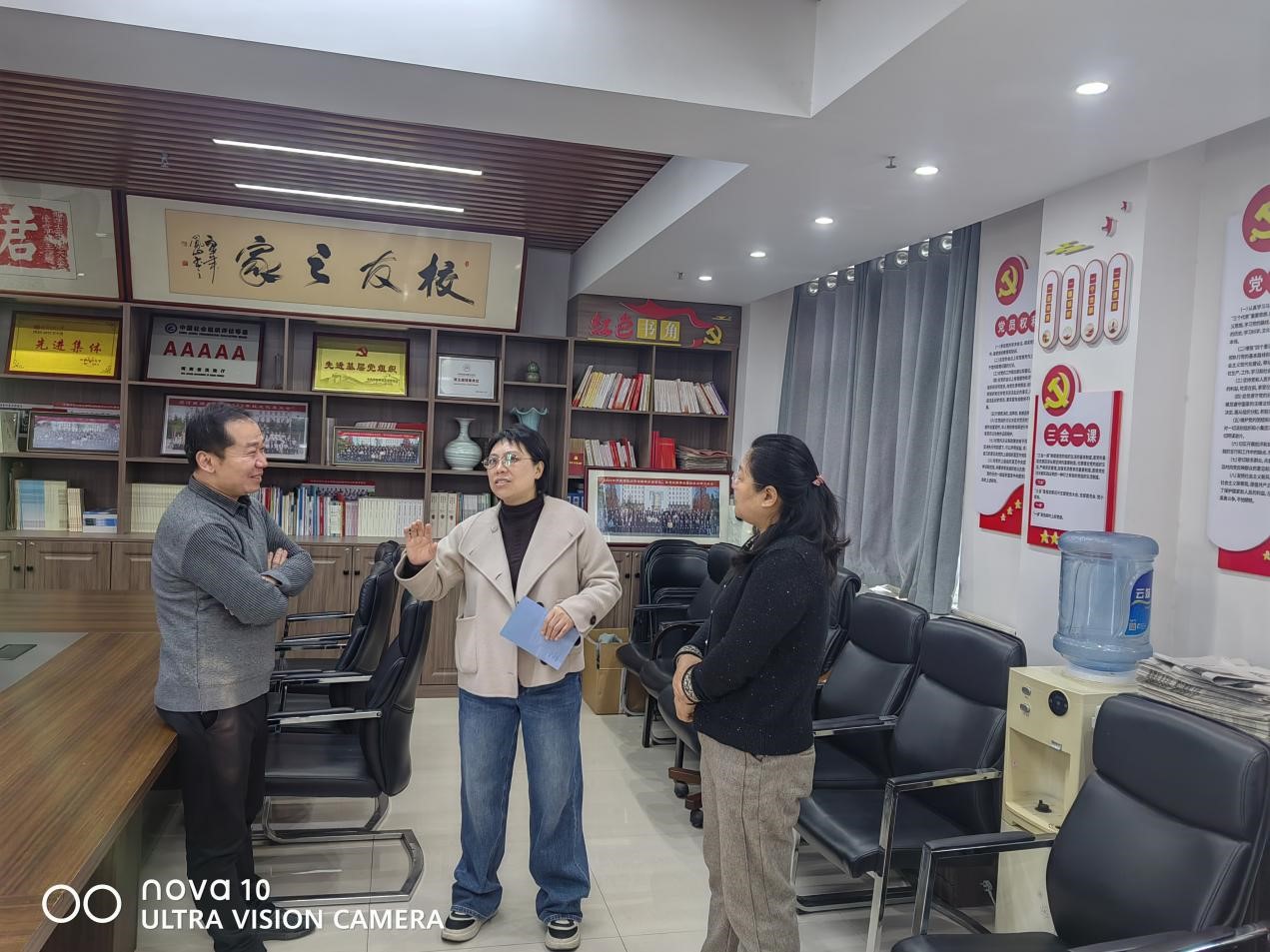 宁敏一行参观了校友与基金工作办公室致远楼现有党建场所建设情况,并实地考察了启智楼新办公地点现场。而后,宁敏与校友与基金工作办公室人员进行了深入交流,她肯定了校友党支部的党建工作,尤其在校友联络、资源争取等方面取得的显著成绩。她指出:“教工之家”是学校或教育机构内,由工会组织为教职工设立的综合性活动场所,教工之家是组织开展教职工开展综合性活动,进行会员教育,加强工会自身建设的主要阵地,旨在为教职工提供休闲放松、沟通交流、文体活动和学术研讨的空间,以增强团队凝聚力和归属感。此次校友办公地点调整,校友要把单位发展与党的建设相融合,通盘考虑,精心谋划,合理布局,切实加强校友与基金工作办公室党建工作。