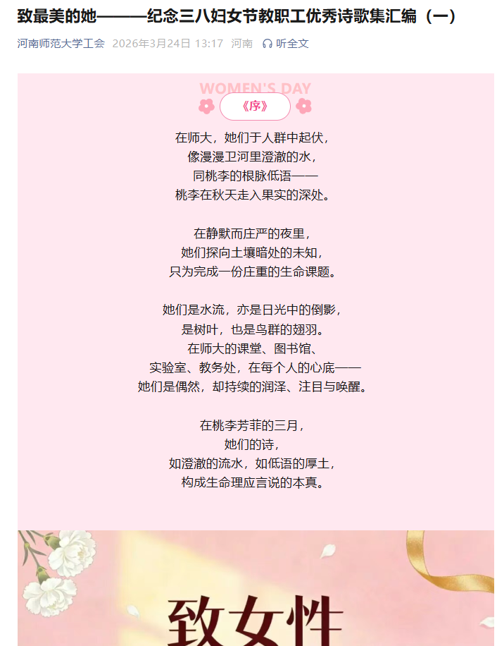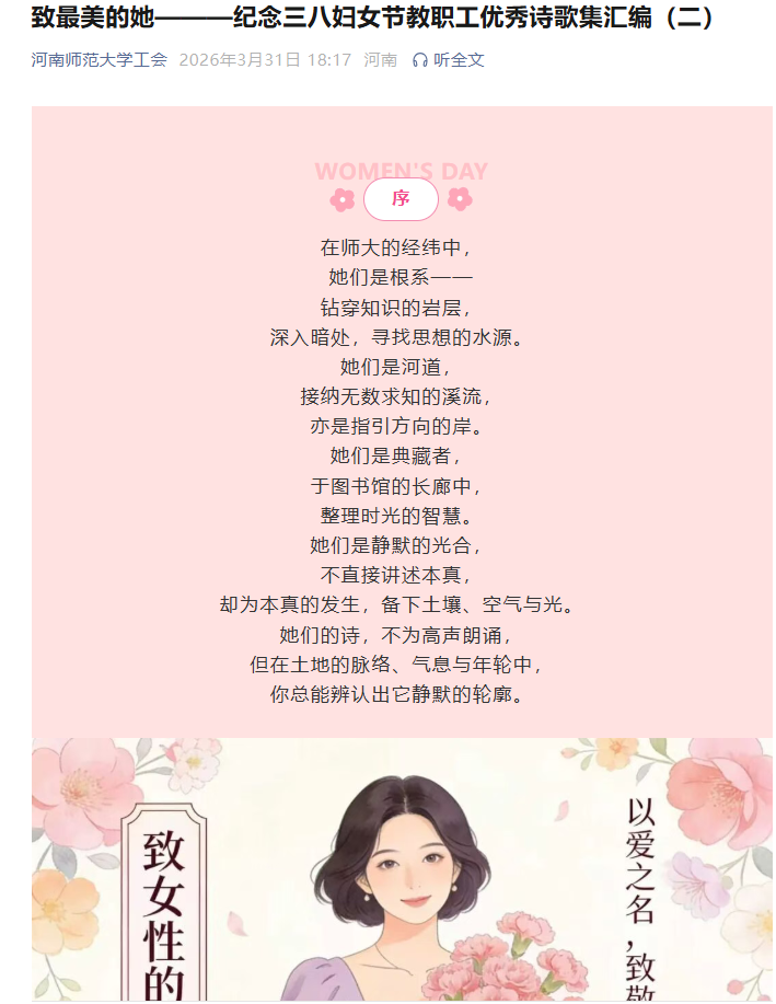 此次诗歌征集活动不仅为师生搭建了抒发情感的文学平台,更以文化人、以情感人,充分展现了我校女性昂扬向上、追求卓越的精神风貌。这些优秀作品既是对女性教职工的深情赞美,也展现了我校女性教职工“自尊、自信、自立、自强”的精神风貌。让我们在诗意中致敬每一位在平凡岗位上书写不平凡故事的师大女性,愿她们如三月春光,明媚温暖,在教育的沃土上继续绽放芳华。