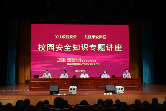 为深入贯彻习近平总书记关于安全生产的重要论述,在学院师生中全面普及校园安全知识,增强学院师生的校园安全意识,提升学院师生的主动防范能力,9月18日下午,由学院保卫部主办,党委学工部、团委协办的校园安全知识专题讲座在多功能报告厅举行。新乡市公安局党委委员、刑侦支队政委任建新,新乡市公安局纬五路分局局长张强,新乡市公安局反诈中心负责人侯军、反诈止付中心警官陈捷,学院党政领导、全体教职工和部分学生代表听取讲座。讲座由新联学院副院长宋京双主持。