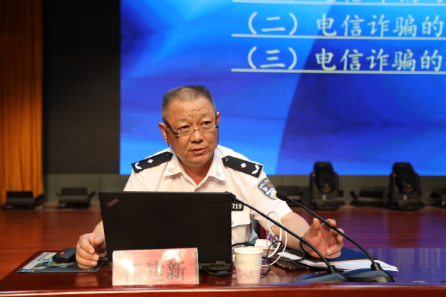 任建新作为主讲人从电信诈骗的起源、特点和防范手段三个方面做了专题报告。他从一个电信诈骗题材的小品开题,形象生动地展示了网络刷单、冒充公检法人员传唤、猜猜我是谁、网购退款、虚构绑架或紧急情况索取钱财、银行卡消费异常、虚构中奖领钱、盗用个人信息借钱、高薪招聘、网络交友等十种电信诈骗的常见手段。他指出,近年来电信诈骗呈现出了作案手段翻新快、智能化程度不断增强,诈骗窝点向中西部和境外转移,诈骗犯罪团伙呈现公司化、集团化管理,作案手段更趋隐蔽,跨国跨境电信诈骗犯罪呈增多之势,冒充国家机关诈骗成新的诈骗形式且逐渐增多等许多新特点,破案难度不断增大。同时,与现场师生分享了网上活动不要贪图小利,短信链接不要随意点开,有关转账的验证码不要透漏,不显示号码的电话不要接,陌生的证据不要信,钓鱼网站要提防,遇到疑似电信诈骗要马上报警等多种防诈骗“秘籍”,简单易记,方便使用。