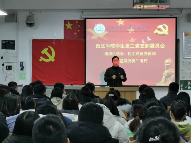 首先,政法学院党总支书记刘擎同志传达上级关于2019年度党支部书记抓党建工作民主评议及“五星级党员”考评工作的会议精神,说明民主评议的要求和结果,明确此次评议工作只有正式党员有被选举权,其他预备党员要积极向优秀党员学习。然后,政法学院学生第一党支部书记刘冬冬同志进行发言,刘冬冬同志表示民主评议工作更重要的是过程,是发现优秀向优秀学习的过程,无论评议结果如何,所有党员都应该在评议中发现自身缺点并在以后的工作学习中积极改正,这样每位党员同志都是优秀党员。接着,政法学院学生第二党支部书记叶苗同志进行发言,叶苗同志提出大家要把学习先进当成永恒的主题,向每一位党员同志的优点学习。同时,民主评议工作是一项严肃的工作,希望各位党员同志在互评阶段能基于公平公正的原则进行评分,共同维护民主评议的公平性。