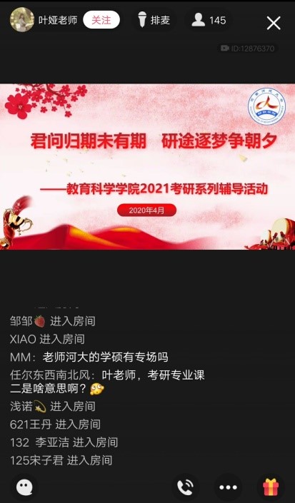 为适应“停课不停教、停课不停学”线上教学形式,营造健康的线上考研辅导环境,形成良好的线上考研文化,保障学生学习质量,教育科学学院特面向2017级本科及2019级专升本各班,针对性开展“君问归期未有期 研途逐梦争朝夕”2021考研系列辅导活动。4月9日晚19点30分,通过线上直播的方式开启了2021考研系列辅导活动第一篇——一“研”到底,陪你同行。