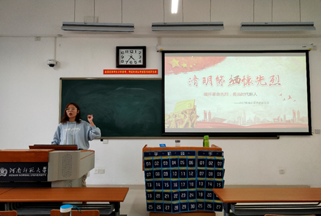 本次活动由团支书郭柄汝主持,活动伊始,主持人阐述了此次活动举办的背景和意义,并以一段视频拉开类此次活动的序幕。首先,由团支书讲解清明节的来源及传统,以使大家对于清明有更加全面深刻的认识。