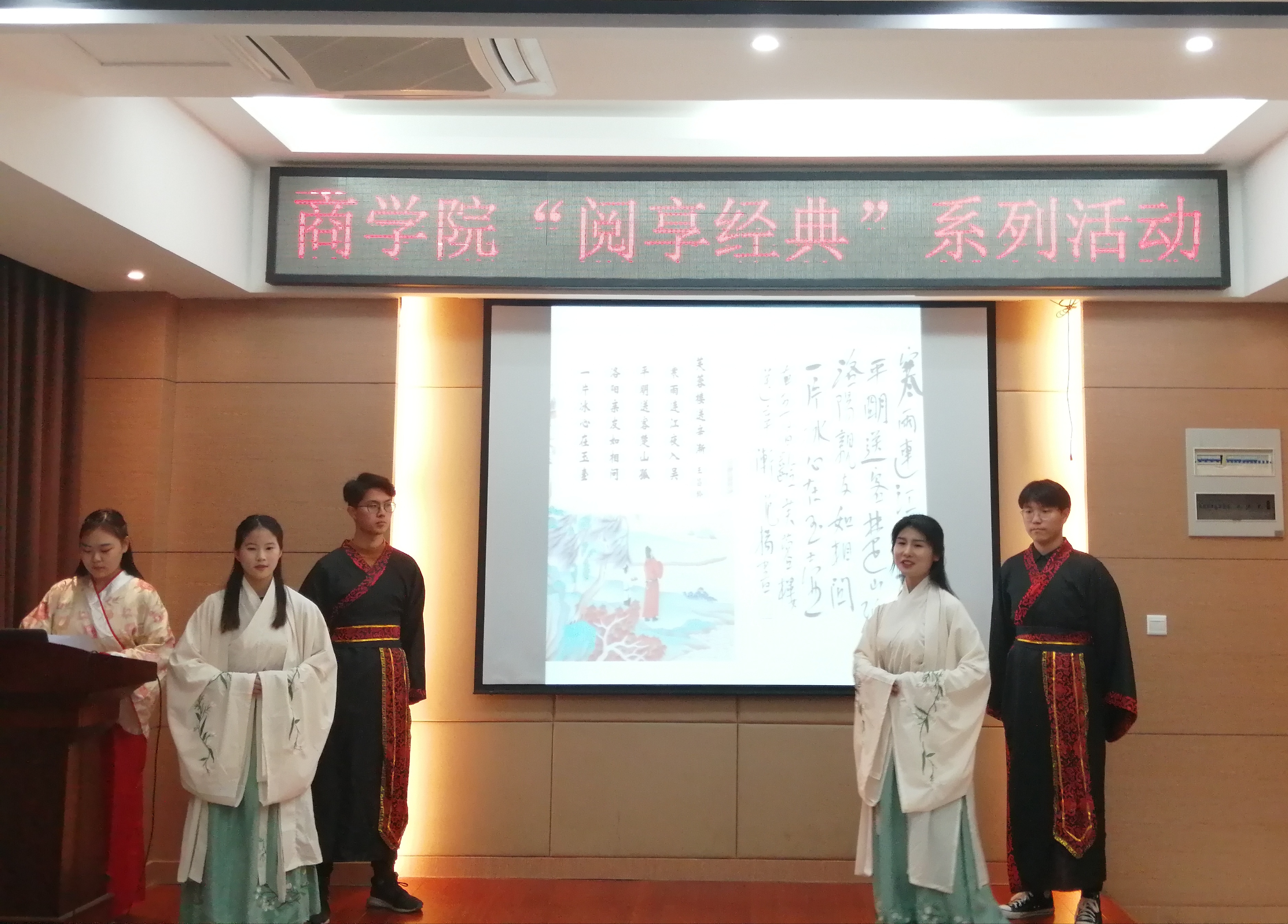 诗书诵古韵,经典咏流传。为激发学生们热爱经典,传承优秀文化的热情,提高学生文化素养,11月13日晚,商学院于学院楼119报告厅举办了“阅享经典”系列活动。学院相关负责人及广播站播音部负责人受邀出席并担任评委,2019级部分学生到场观看了本次比赛。