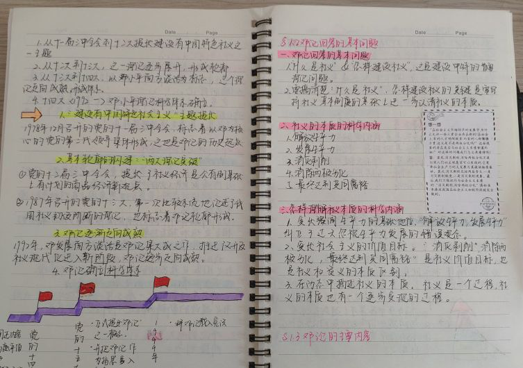 活动以各班级划分的网格小组为单位展开,学生将当天的课堂笔记图片上传至组内指定相册进行打卡,班委汇总并挑选出优秀笔记参与院内的每周评比。活动中,学院学生奇思妙想,将趣味思维导图与专业学科知识巧妙结合,利用不同颜色的标注凸显主次要点,在整体知识框架下不断填充学科内容。其中,2019级国际政治专业学生杨海雯在笔记间隙填补简笔画,以形象的图画串联起知识要点,加深对学科知识的吸收和理解。2018级政治学与行政学专业学生郑静怡的课堂笔记条理清晰、整洁大方,在梳理、整合课堂内容的同时更写下自己对于重要知识点的思考和见解。