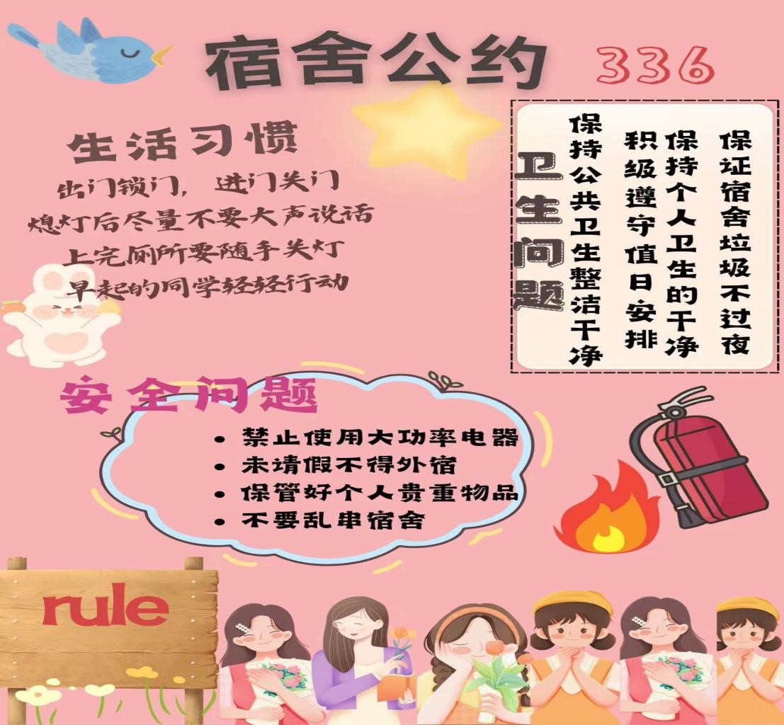在本次活动中,同学们以宿舍为单位,围绕宿舍公约、宿舍安全等相关主题,团结协作,默契配合,充分发挥想象力和创造力,制作出带有自身寝室特色的海报作品。一句句言语主题深刻、意蕴丰富;一个个图案构思新奇、构图巧妙;一张张海报制作精湛、画面优美,展现出独特的寝室文化,彰显出互助互爱、积极愉悦的寝室氛围。在作品评选环节中,评委们秉持公平公正原则,最终评选出一批优秀海报作品。其中,336寝室的作品画面精致漂亮,宿舍成员卡通形象可爱灵动,并紧扣主题,从“生活习惯”“卫生问题”“安全问题”三个方面出发,阐明了寝室公约,构思精巧,图文并茂,在一众海报作品中脱颖而出。307寝室别出心裁,通过引用每位寝室成员的“名言”,配以清新雅致的画面风格,勾勒出温馨美好的寝室生活图景,传达出昂扬向上的寝室精神面貌。