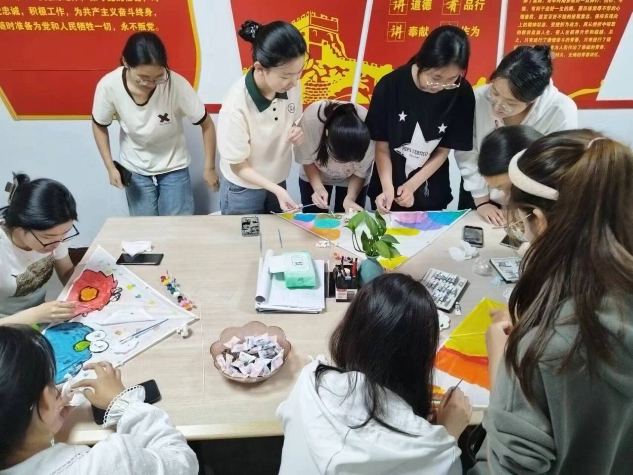 活动中,同学们分工协作、各展才能,有条不紊地以空白风筝为“画布”勾勒春天的灿烂,挥洒青春的才思,表达对未来的美好憧憬。吴安琪同学结合自己所喜欢的动漫文化元素在风筝上绘出了斑斓而又可爱、灵动之春;田春雨同学则别出心裁,构思奇特,通过巧妙拼接将多种文化元素融合在一起,充分展现了自己的创造能力。辅导员邢凯鼓励同学们可以尝试将类似艺术活动与所学专业或其他领域相结合,如艺术+科技、艺术+社会文化、艺术+哲学等,拓宽文化视野,培养跨学科思维。