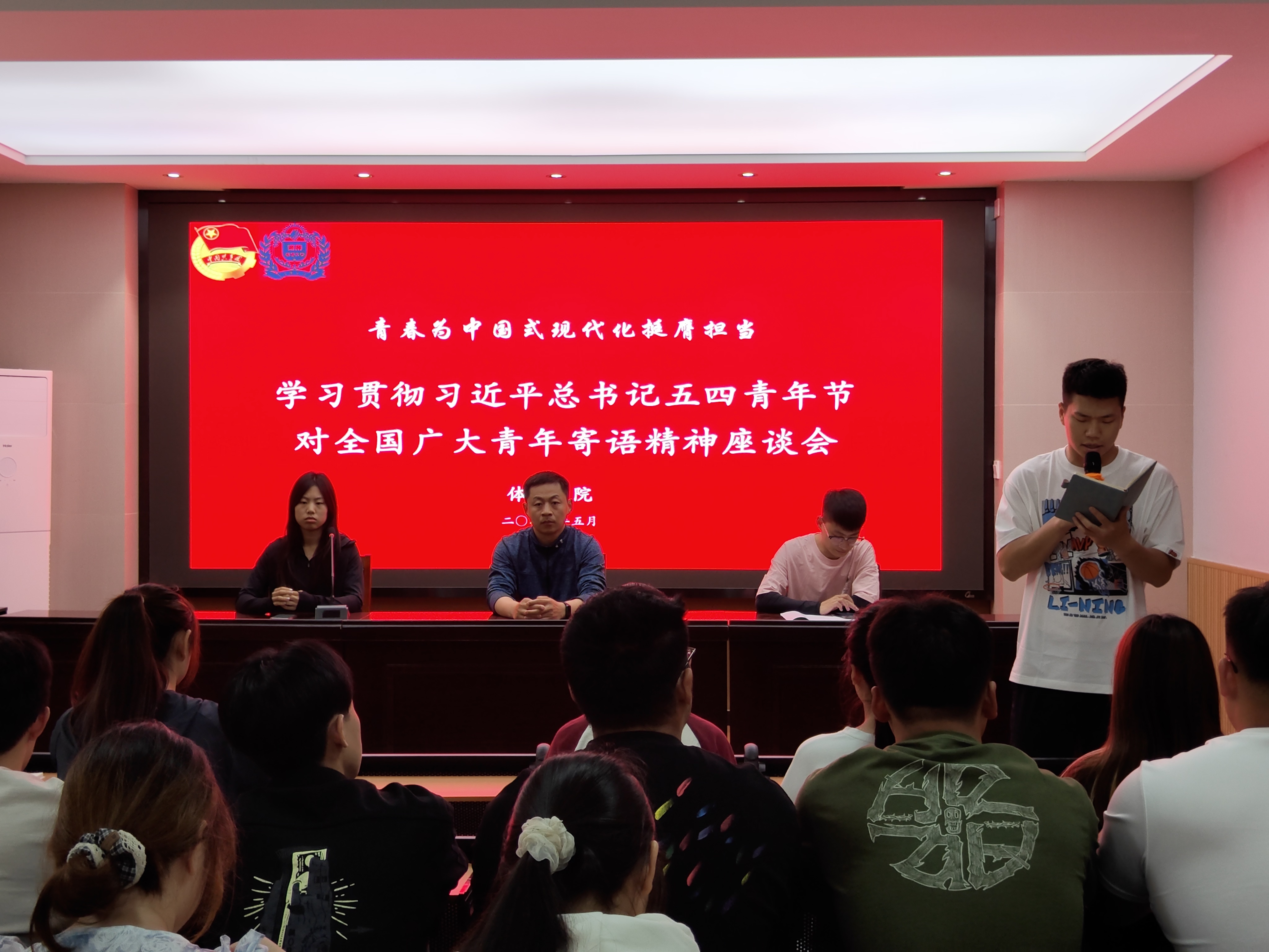 在五四青年节到来之际,中共中央总书记、国家主席、中央军委主席习近平代表党中央,向全国广大青年致以节日祝贺和诚挚问候。5月7日中午,体育学院团委召开专题座谈会,团委书记刘广宣领学了习近平总书记五四青年节对全国广大青年寄语精神,2022级辅导员安东、各年级团支部书记、学生会、班长等参加了座谈会。