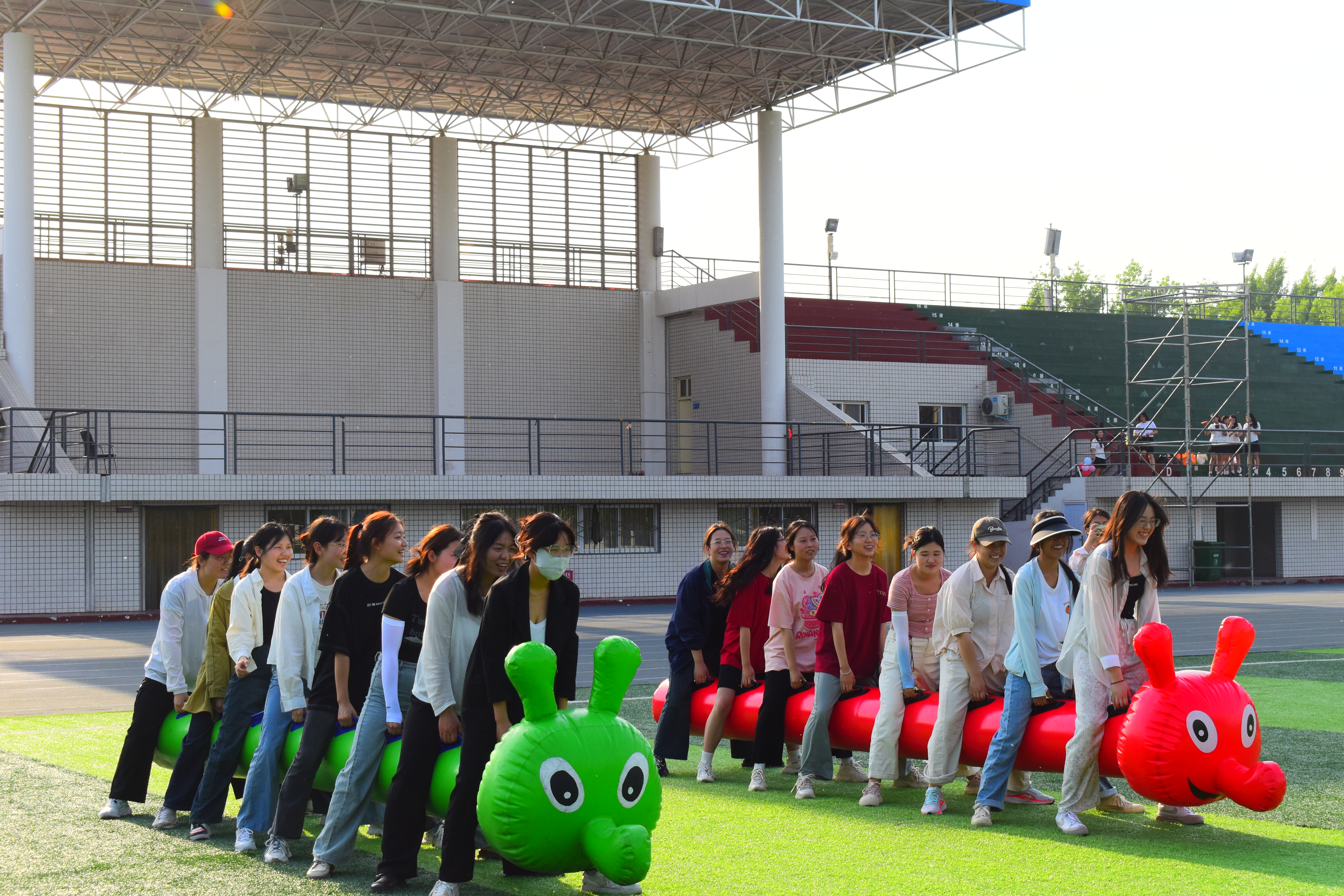 本次活动有“疯狂毛毛虫”、“不倒森林”、“财源滚滚”、“能量传输”、“同舟共济”、“众星捧月”六个项目,同学们以团学部门为单位在各个项目之间进行比拼。“财源滚滚”和“同舟共济”考验了同学们的默契度和团队协作能力;“能量传输”需要同学们细心与勇气并存;“不倒森林”要求同学们不仅要对自己怀有信心,更要有将自己托付给同伴的底气;“疯狂毛毛虫”则是对同学们的体力与耐力提出要求。活动期间,各个团学部门激情四射,积极投身于每一个环节,将现场氛围推至高潮。他们走过一条条“独木桥”,跨过一扇扇“任意门”,举起一座座“高山”。他们冲破重重障碍,冲破终点的同时也越过了心里的沟壑。在大家的共同努力下,各部门成功完成每一个项目,操场上的掌声和欢呼声此起彼伏。最后,按照各个部门完成时间评选出了一、二、三等奖,并现场发放奖品。