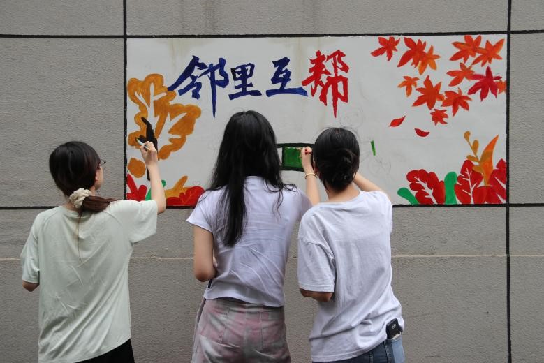 此次活动中,参与学生围绕“党建引领聚合力,共建共治绘和谐”的主题进行相应的墙绘创作。其中,在党建主题墙绘中,学生坚持党建引领的原则,完成了“党在我心中”红色墙绘的创作,以直观易懂的方式传播党的精神。在“邻里互帮”主题墙绘中,学生用鲜艳的色彩构画出一幅邻里团结友爱、互相帮助的社区生活画卷,向社区居民传递“以邻为友”和“以邻为亲”的思想。活动结束后,参与学生纷纷表示他们在墙绘创作中享受了绘画的乐趣,同时也感受到了基层社区共建、共治、共享的良好氛围。