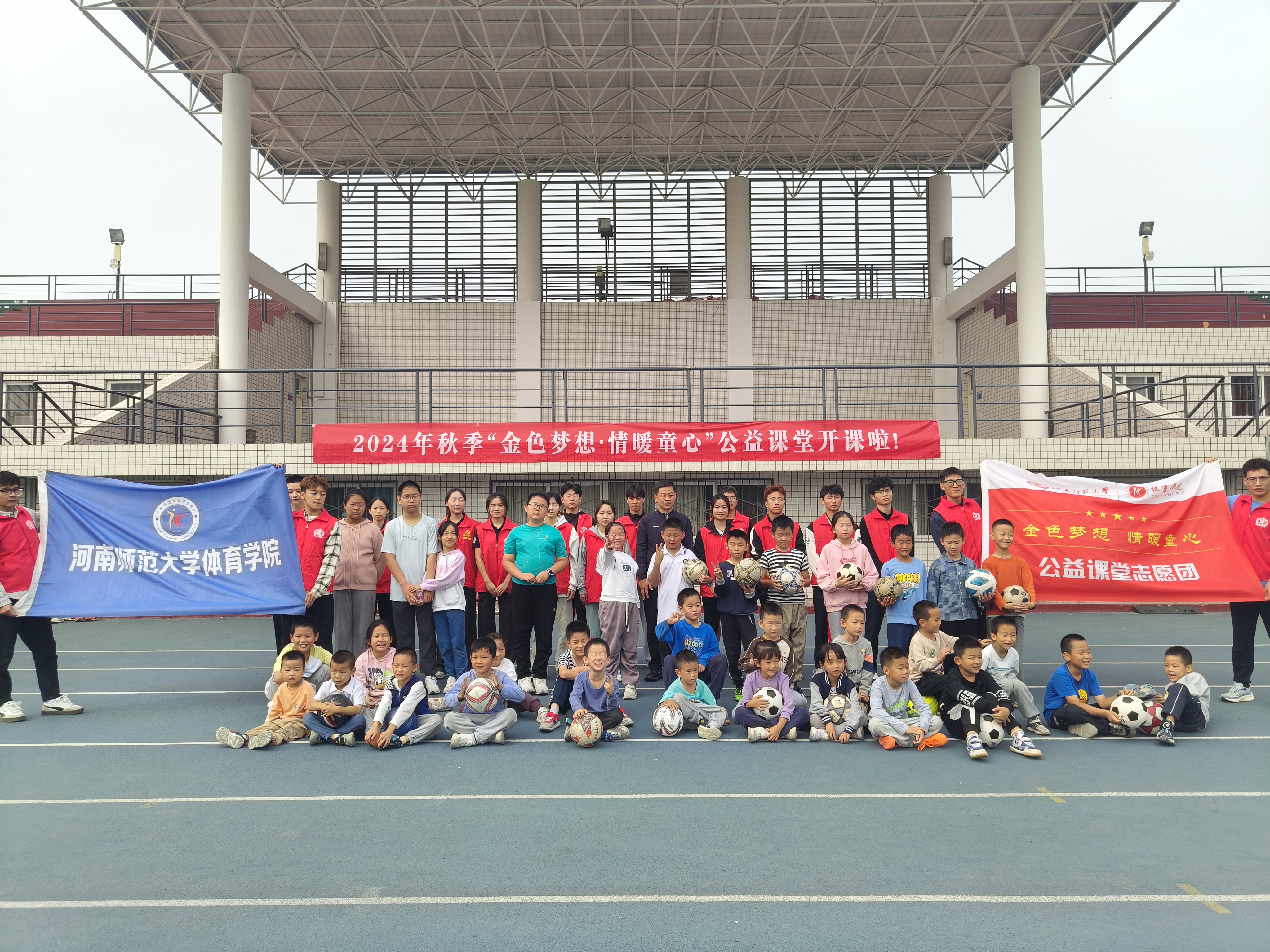 10月20日上午,体育学院在西区田径场举行2024年秋季“金色梦想·情暖童心”公益课堂开课仪式,未来一学期每周末将会开展足球、篮球、跆拳道、乒乓球、体育中招培训等公益课。体育学院相关负责人,公益课堂全体教练、学员及家长参加开课仪式。