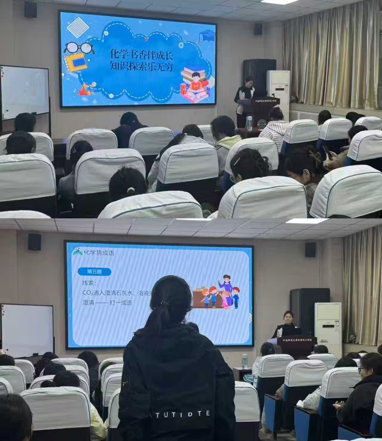 本次活动以“书籍为纽带、学科为桥梁”为主线,设置了主题引入、趣味互动和价值提炼等多个环节。活动伊始,同学们观看了化学与文学跨界主题视频,并围绕《毛泽东选集》《元素的故事》等书籍片段展开研读,进一步阐释了学科融合在知识学习中的积极意义。随后的趣味互动环节以“盲盒抽题”拉开序幕,题目结合化学原理与文学常识,采用抢答形式,既考验了同学们的知识储备,也迅速点燃了现场气氛。紧接着,各小组开展了“化学成语/诗句大闯关”活动,将铁制品生锈、镁条燃烧等化学现象与成语意境巧妙结合。不少同学表示,这种跨界学习让知识变得生动而鲜活,也真切感受到书籍作为“纽带”的独特魅力。活动最后,支部倡议同学们将学科融合思维融入日常专业学习,鼓励大家“读学科经典、探融合之趣、强专业能力”,将活动收获转化为持续学习的动力。
