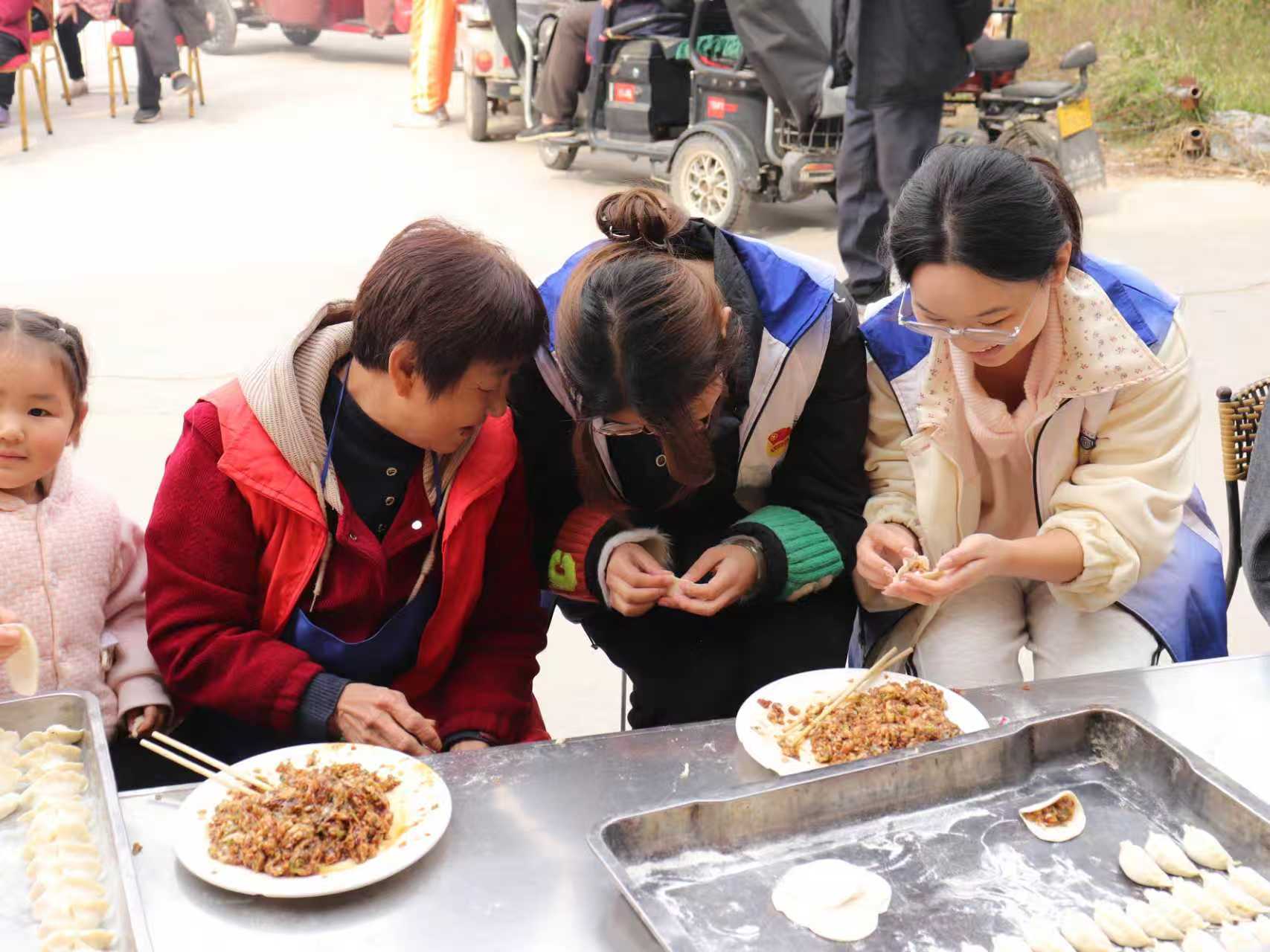 活动伊始,志愿者们集结后乘车抵达活动场地,迅速完成分工并布置好活动现场。“数字助老”环节率先展开:志愿者们一对一陪同老人,耐心指导他们学习解锁手机、使用微信视频通话、线上缴费等智能设备基础操作,不少老人从“不敢碰”到能独立发语音,实现了显著的进步。随后,小杨庄村党委书记王树全开场致辞,志愿者与村民共同呈现了朗诵、舞蹈、小品、戏剧、跆拳道和歌曲等精彩节目,赢得满堂喝彩。展演间隙,饺子宴同步开启,志愿者与老人围坐协作,在包饺子的过程中展开亲切交流,热腾腾的香气里满是邻里的融洽。餐后,志愿者们将打包好的饺子送到行动不便的老人家中,让温暖关怀传递至每一户。最后,志愿者代表朱晓倩总结活动意义,强调敬老爱老是中华民族的传统美德,也是学院育人工作的重要组成部分。