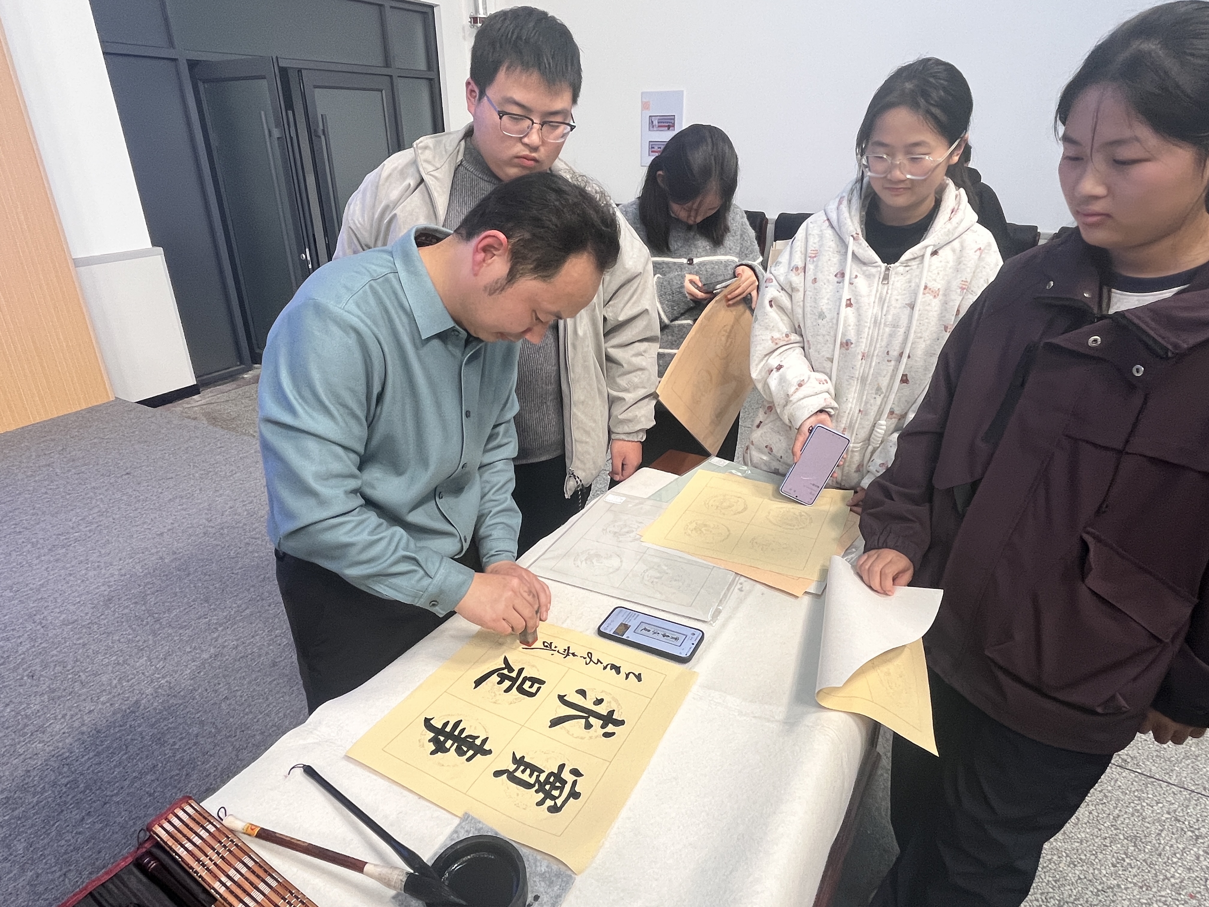 “原本觉得书法离日常很远,今天跟着王老师‘认甲骨文、看碑帖细节’,才发现笔墨里藏着这么多故事!”美术学院2023级刘子嫄同学课后说道,“尤其是老师现场写‘福’字和校训时,笔墨翻飞间全是力量,我已经准备好字帖,想试着从基础练起了。”