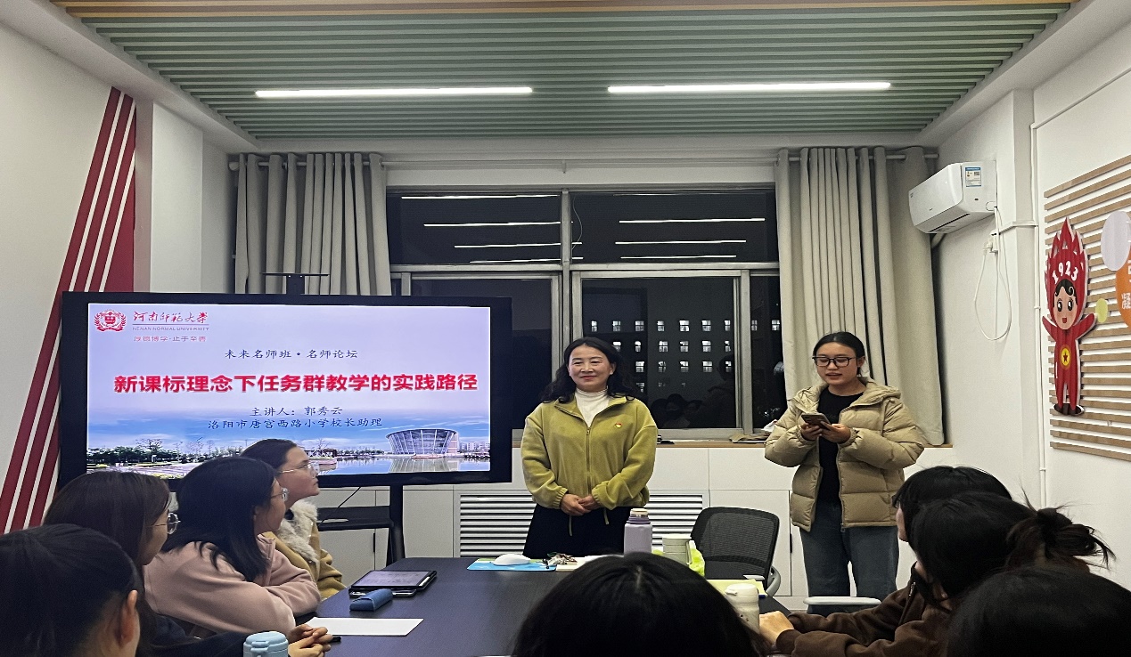 为深入贯彻新时代教育方阵与育人理念,提升师范生专业核心素养与教学实践能力,11月9日晚,未来学院“未来名师班”邀请河南省“万名中小学校长培训计划”第七期学员开展第三期名师论坛。本次论坛以“新课标理念下任务群教学的实践路径”为主题,特邀洛阳市唐宫西路小学校长助理、中小学高级教师郭秀云担任主讲人。