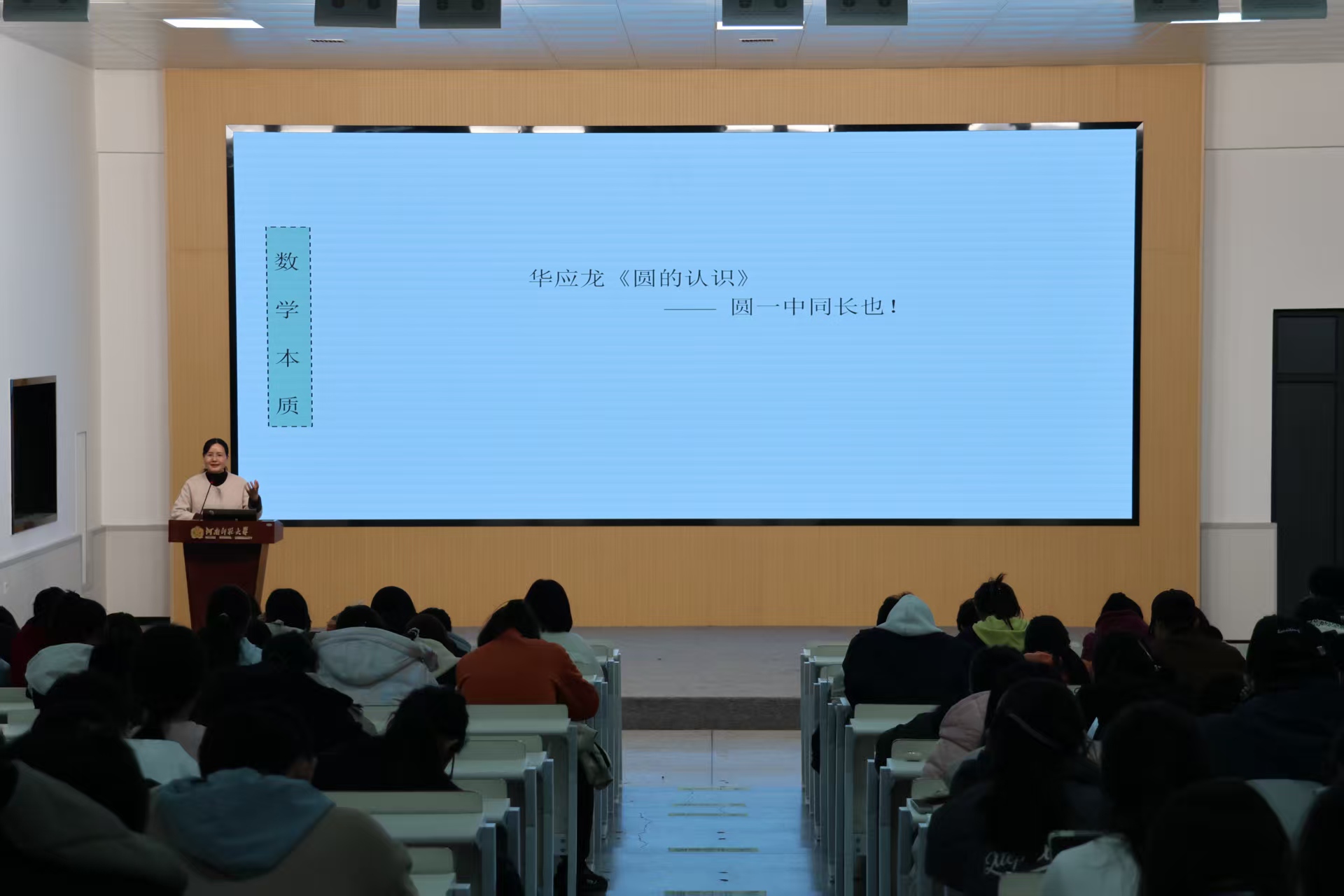 为有效提升师范生的教育情怀、学术素养和综合能力,引导师范生重塑对教师角色的认知,清晰规划从学生到教师的角色转型路径,11月23日晚,我校2025-2026学年第五期“智汇名师讲堂”师范生成长专题讲座在西校区学苑餐厅三楼树蕙堂成功举办。本次活动由共青团河南师范大学委员会与河南省“万名中小学校长培训计划”联合主办,特邀安阳市刘家庄小学副校长、河南省名师康莉担任主讲嘉宾,来自各院系的400余名学生共同聆听报告。