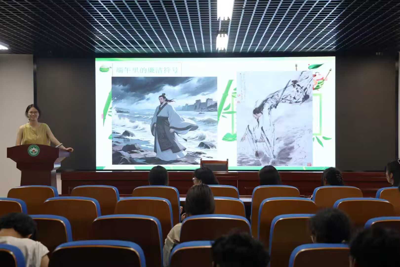 活动伊始,负责人通过生动的讲述,带领同学们穿越历史长河,深入探寻端午节的历史渊源,深挖细悟其中蕴含的廉政文化元素,从古老的祭祀仪式到民间的驱邪祈福,再到爱国诗人屈原“宁廉洁正直以自清”的高尚气节和“宁赴湘流,葬于江鱼之腹中。安能以皓皓之白,而蒙世俗之尘埃乎”的铮铮铁骨,端午节丰富的文化内涵被一一展现。活动还设置了“清廉知识问答”互动环节,内容涵盖端午节文化和廉洁知识。同学们踊跃举手、积极作答,现场气氛热烈。