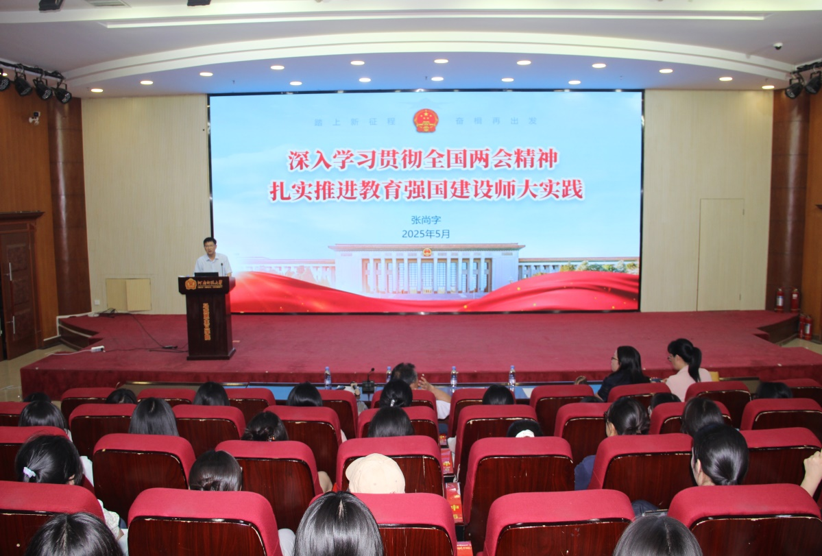 在专题授课中,张尚字从习近平总书记重要讲话精神的理论高度,到教育强国建设规划纲要的政策厚度,再到学校发展顶层设计与教育实践的行动力度,系统阐述了服务国家重大发展战略、推进教育强国建设、锚定学校发展目标的发展蓝图。他带领现场师生首先学习了习近平总书记在今年两会期间看望参加全国政协十四届三次会议的民盟、民进、教育界委员时的重要讲话精神等内容,系统解读了2025年政府工作报告要点,引导广大师生把个人的工作学习融入国家重大发展战略。在这一宏观视野下,张尚字带领师生深入解读《教育强国建设规划纲要(2024-2035年)》,系统介绍了教育强国建设的总体目标、重点任务和实施路径。从2027年取得重要阶段性成效到2035年建成教育强国的时间表,从“三大属性”“六大特质”“五个重大关系”的理论框架到“八大体系”“九方面任务举措”的实践路径,张尚字带领现场师生深入学习领会全国教育大会精神,激励大家在教育强国建设中展现更大担当作为。