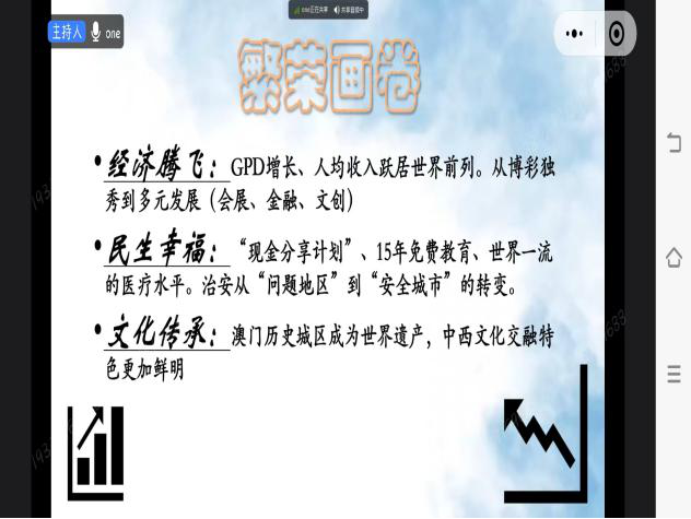 活动伊始,一段精心剪辑的影像资料徐徐展开,镜头中既有澳门回归谈判桌上的唇枪舌剑、回归盛典上五星红旗与澳门区旗冉冉升起的庄严时刻,也有回归后澳门街头日新月异的发展变迁。同学们全神贯注观看,跟随影像脉络重温澳门回归的时代背景,深入学习澳门回归在维护国家主权、安全、发展利益中的重大历史意义,深刻体悟“一国两制”方针从理论构想到成功实践的伟大跨越,对这段镌刻着民族荣光的历史有了更为系统、深刻的认知。在互动交流环节,同学们围绕澳门回归前后的经济腾飞、民生改善与文化交融等议题,结合查阅的资料与自身见闻踊跃发言,线上讨论区里观点碰撞、思想交融,大家在交流分享中深化了对国家统一与民族复兴的理解,进一步增强了身为新时代青年的责任感与使命感。