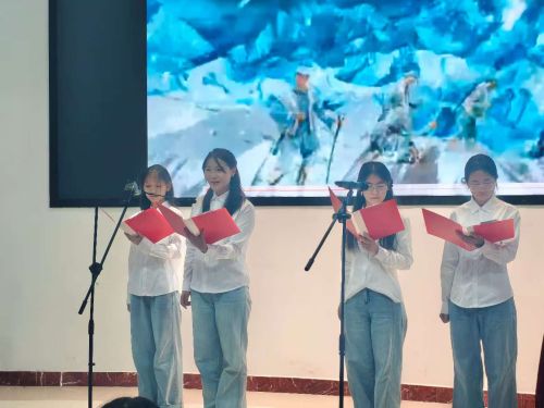 演出中,朗诵团成员武佳怡、侯佳慧、侯雯雯、王昕雨带来作品《还看今朝》。她们将革命诗词中的豪情与初心融入声音,从《贺新郎·别友》的婉约深沉,到《沁园春·雪》的雄浑磅礴,再至《念奴娇·井冈山》的慷慨激昂,层层递进,尽展峥嵘岁月里的热血情怀。另一组演员杨澜、李依桐、郭冉、燕飞翔则以《春江花月夜》为轴,通过错落有致的声部交织与细腻入微的情感把握,勾勒出一幅空灵悠远的春江月夜图。“江天一色无纤尘”等经典诗句,在众人合诵中更显意境幽深、韵味绵长。
