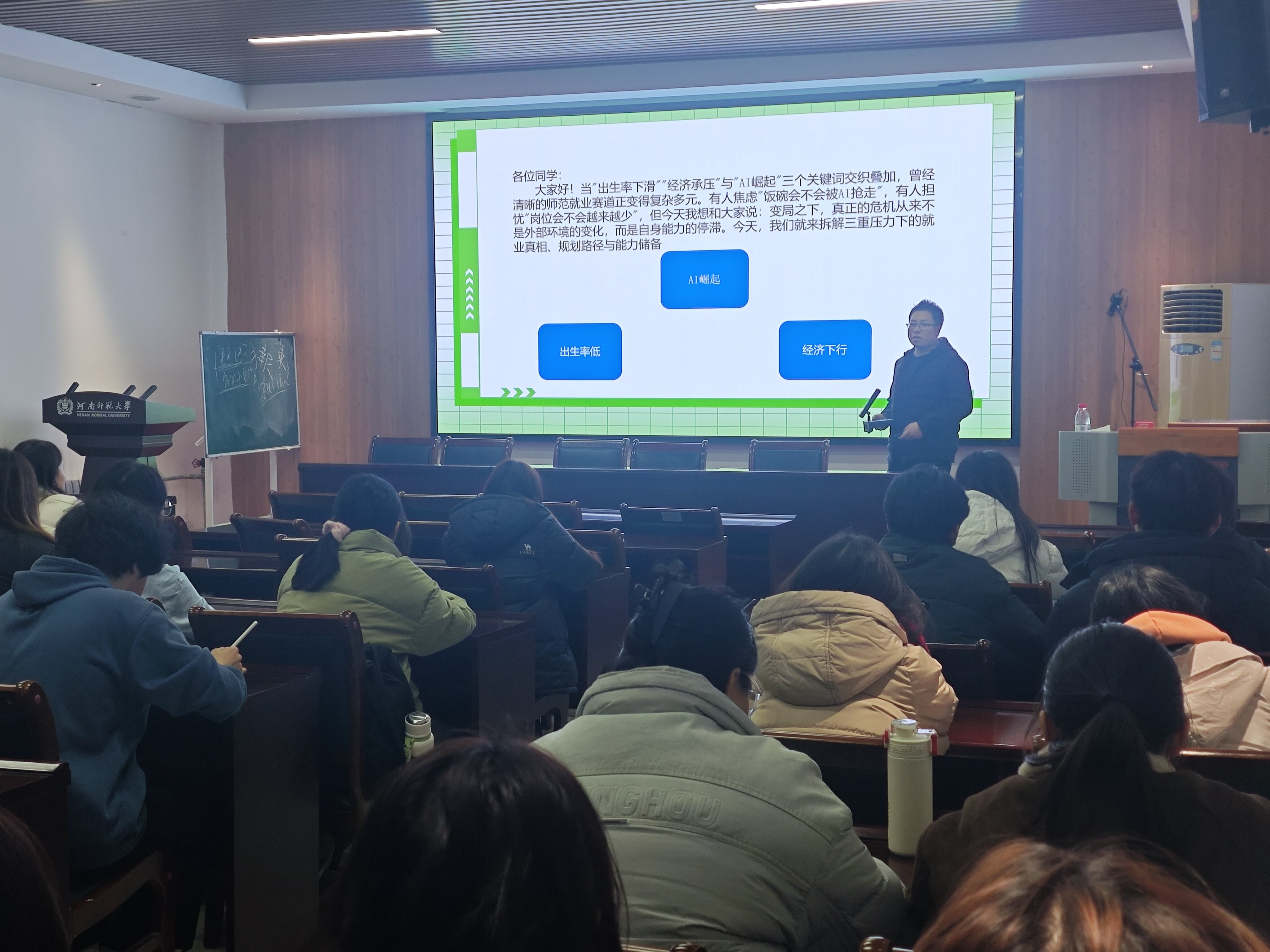 为进一步帮助师范生树立正确的就业择业观,12月28日晚,美术学院于学院办公楼311会议室举办“智汇名师讲堂”就业发展专题讲座。本次讲座聚焦“出生率低”“经济下行”“AI崛起”三重变局下美术师范专业的就业挑战,特邀三门峡市中小学高级教师、行业资深教育专家张旭涛担任主讲人,美术学院2024级师范专业全体学生到场聆听,共同探讨就业破局与成长发展的核心路径。