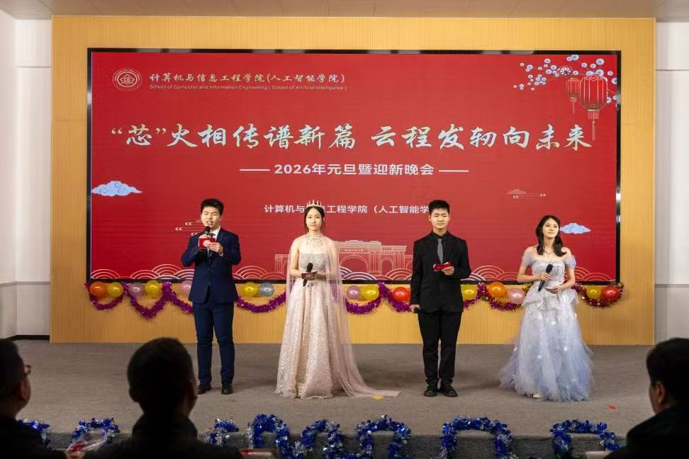 12月29日晚,计算机与信息工程学院(人工智能学院)“‘芯’火相传谱新篇·云程发轫向未来”2026年元旦暨迎新晚会在万人餐厅三楼树蕙堂举行。学院全体领导、教师代表、班主任代表、全体专兼职辅导员和学生共同观看演出。