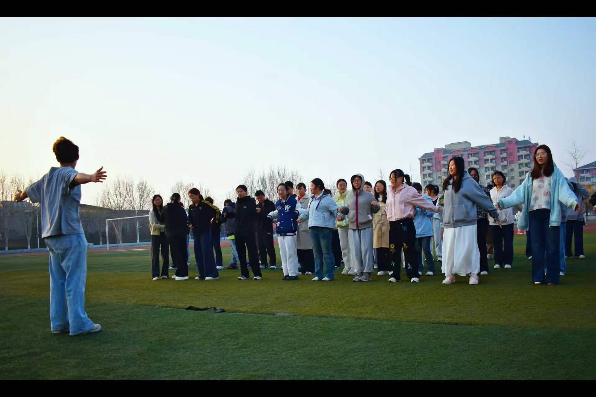 3月25日清晨,历史文化学院“28天健身日记”活动启动后的首场基础健身活动如期开展。本次活动以班级为单位组织进行,由各班文体委员统一带领,参与同学准时到达指定场地,有序开展各项健身内容。活动过程中,同学们首先进行热身活动,充分活动身体关节、舒展肌肉筋骨;随后围绕操场进行集体跑步锻炼,保持整齐队形与良好节奏;跑步结束后,同学们进行整理拉伸,实现运动科学规范。整个活动过程秩序井然,同学们精神饱满、态度认真,现场氛围轻松而充满活力。