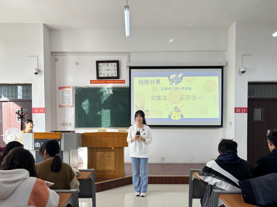 此次活动共分为部门介绍、感悟分享、游戏互动三个环节。在部门介绍环节,学生一同观看志愿服务中心制作的视频短片,进一步了解“奉献、友爱、互助、进步”的志愿者精神,明确自身责任担当。在感悟分享环节,2023级财务管理专业石田佳一表示,同学们可以在志愿服务活动中帮助他人,结交友谊,获得满满的幸福感和成就感。她呼吁同学们从文明餐厅执勤、机房打扫等小事做起,在帮助他人的过程中,实现个人价值与社会价值的提升。在游戏互动环节,“369报数”“闹钟炸弹”“谁是歌王”“你划我猜”等一系列暖场小游戏陆续开展。同学们积极参加,热情高涨,充分展现出积极向上的精神风貌和团结协作的团队精神。最后,活动负责人张静雯进行会议总结,鼓励同学们踊跃参加志愿服务活动,将个人的成长与社会的进步紧密相连,积极投身于广阔的社会实践之中,为志愿服务发展注入新鲜血液,为社会的和谐与进步贡献力量。