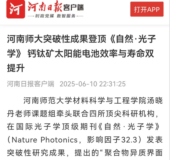 推进科研创新与人才培养协同发展,将学术资源优势转化为服务师生的核心竞争力,构建了科研反哺育人的良好生态。一是推动科研团队优化重组,按照研究方向相关性和教师自愿结合原则,引导形成以高书燕等教授为核心的多个研究组(团队),有力提升科研协作效率和创新活力。多个研究团队研究成果发表于Nature子刊《Nature Photonics》,国际顶尖化学学术期刊《德国应用化学》等,彰显了资源优化配置对科研创新的催化作用。二是为各研究团队提供系统性学术资源支持。借助“材料牛·New Materials”名家讲坛等活动,为学院教师申报国家级项目提供多轮次专家指导,2025年获批国家自然科学基金6项,立项数量取得新突破。与河南心连心化工集团有限公司等多家上市公司、新乡多个区政府部门建立合作对话机制,形成政产学研协同创新、融合发展的新格局。三是将顶尖科研资源转化为育人教材。实施“科研育苗”计划和“本硕同行”计划,搭建科研实践平台和科普宣传平台,推动本科生提早进实验室、进课题组、进科研团队。学院本科生参与发表SCI论文和发明专利的人数逐年增多,每年有数十名本科生积极报名参与省级以上学科竞赛并获奖,展现了良好的科研素养和创新实践能力。