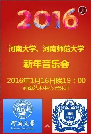 一脉同根 情深意长河南大学、河南师范大学2016年新年音乐会于2016年1月16日晚19:00在河南艺术中心音乐厅(郑东新区CBD1号)举行。详情请点击左下角“阅读原文”本期编辑:悦园 贾晨本期校对:王天意欢迎关注河南师范大学官方微博:河南师范大学大学校友总会(http://weibo.com/hnsfdxxyh)微信号:hnsfdxxyh长按左侧二维码关注 阅读原文