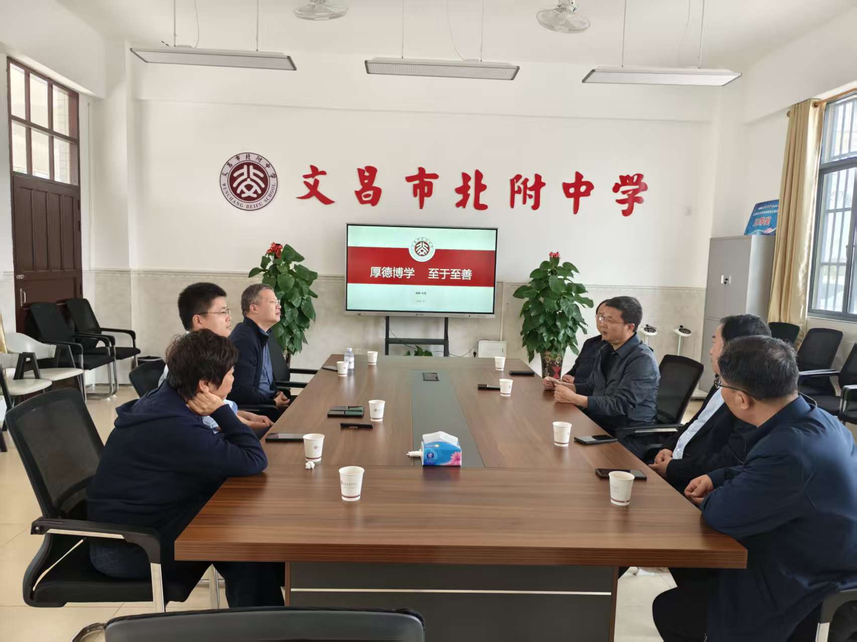 在文昌市北附中学,我校政治与公共管理学院2015届校友、海南中教博雅科技有限公司总经理、文昌市北附中学总支部书记赵坤鹏对杨宝刚一行的到来表示热烈欢迎。他详细介绍了学校的办学特色、发展定位、师资队伍及人才招聘等情况。杨宝刚对文昌市北附中学的办学理念和发展成果表示赞赏。他介绍了学校的学科优势、师范人才培养体系及毕业生就业的整体情况。他表示,希望以此次走访为契机,与文昌市北附中学在师资队伍培训、实习实训基地建设、教育教学研究等方面深化合作,实现资源共享、协同育人,共同为海南的基础教育事业发展助力赋能。