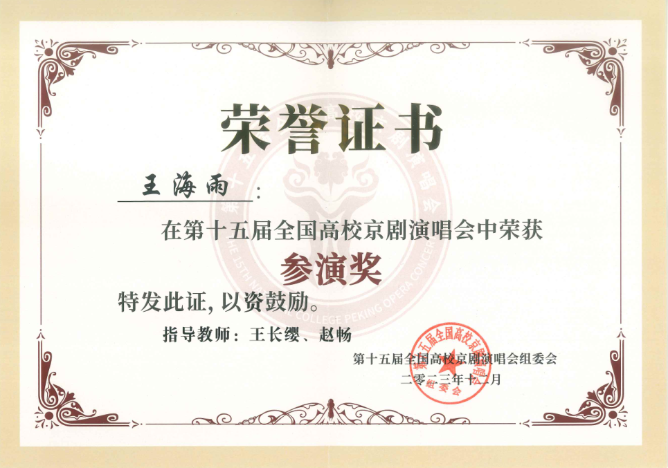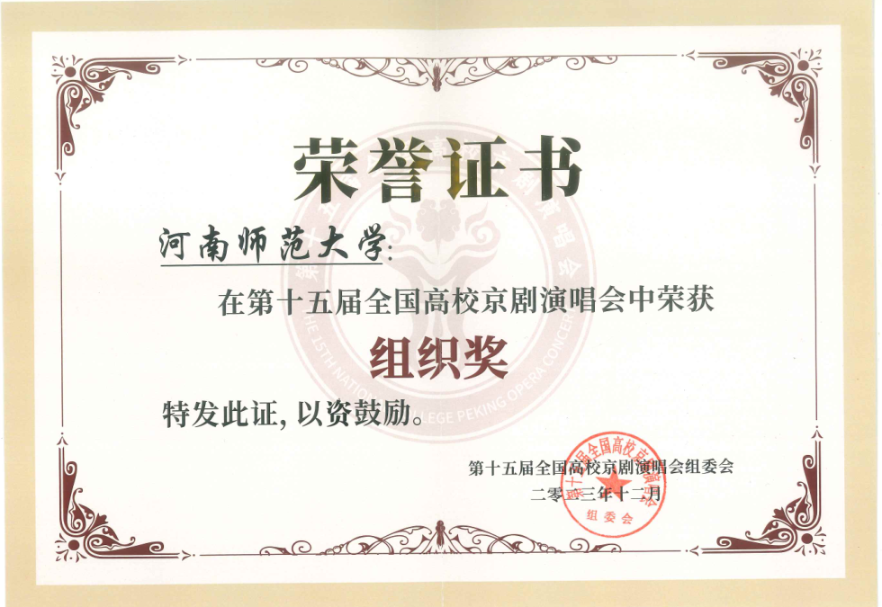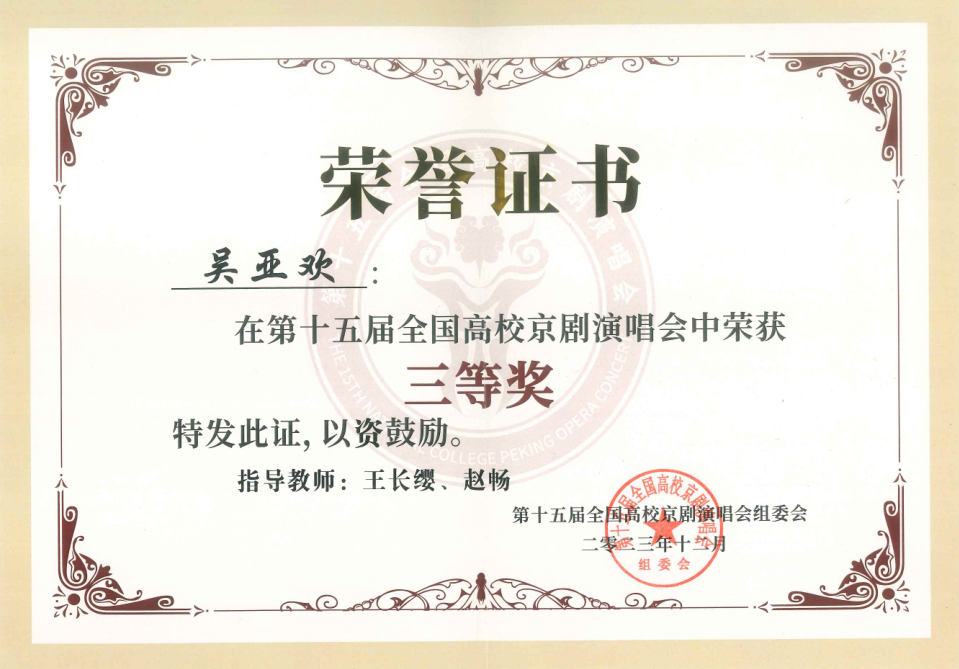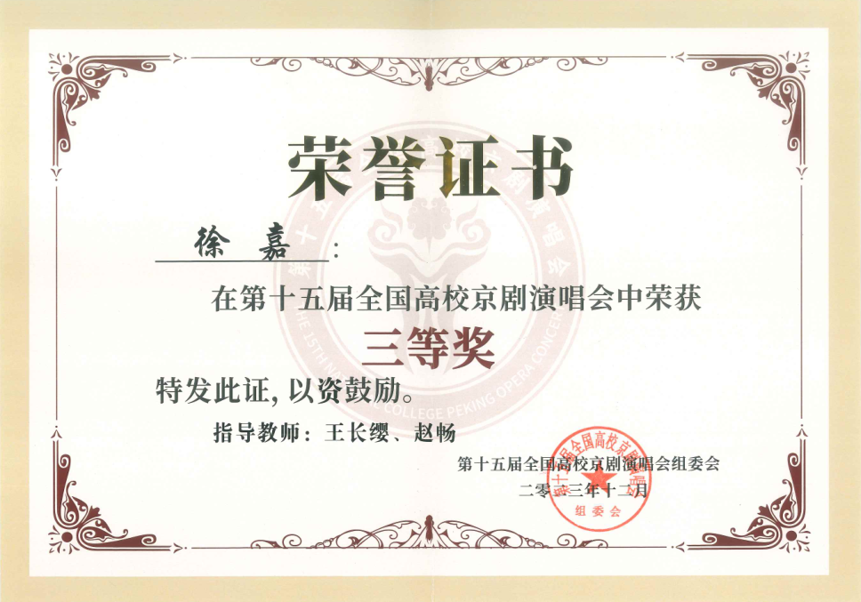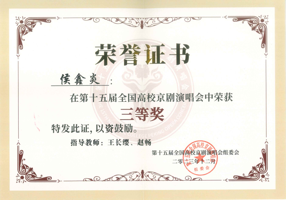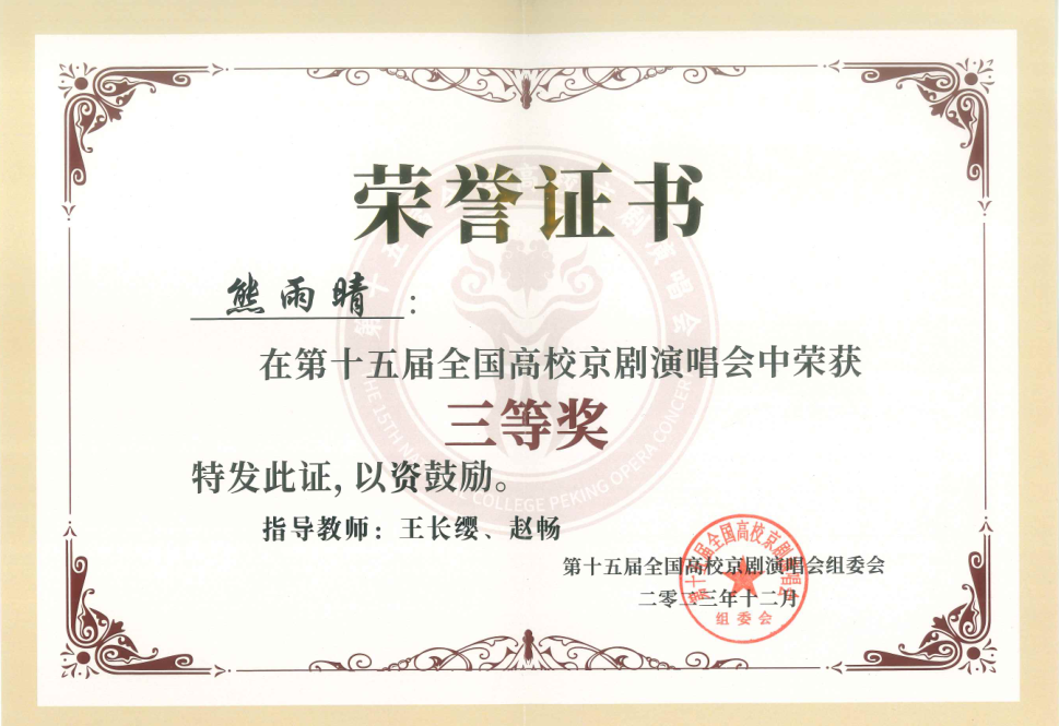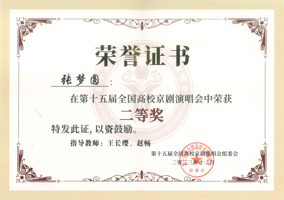 第十五届全国高校京剧演唱会获1个二等奖;4个三等奖;1个参演奖,学校获组织奖