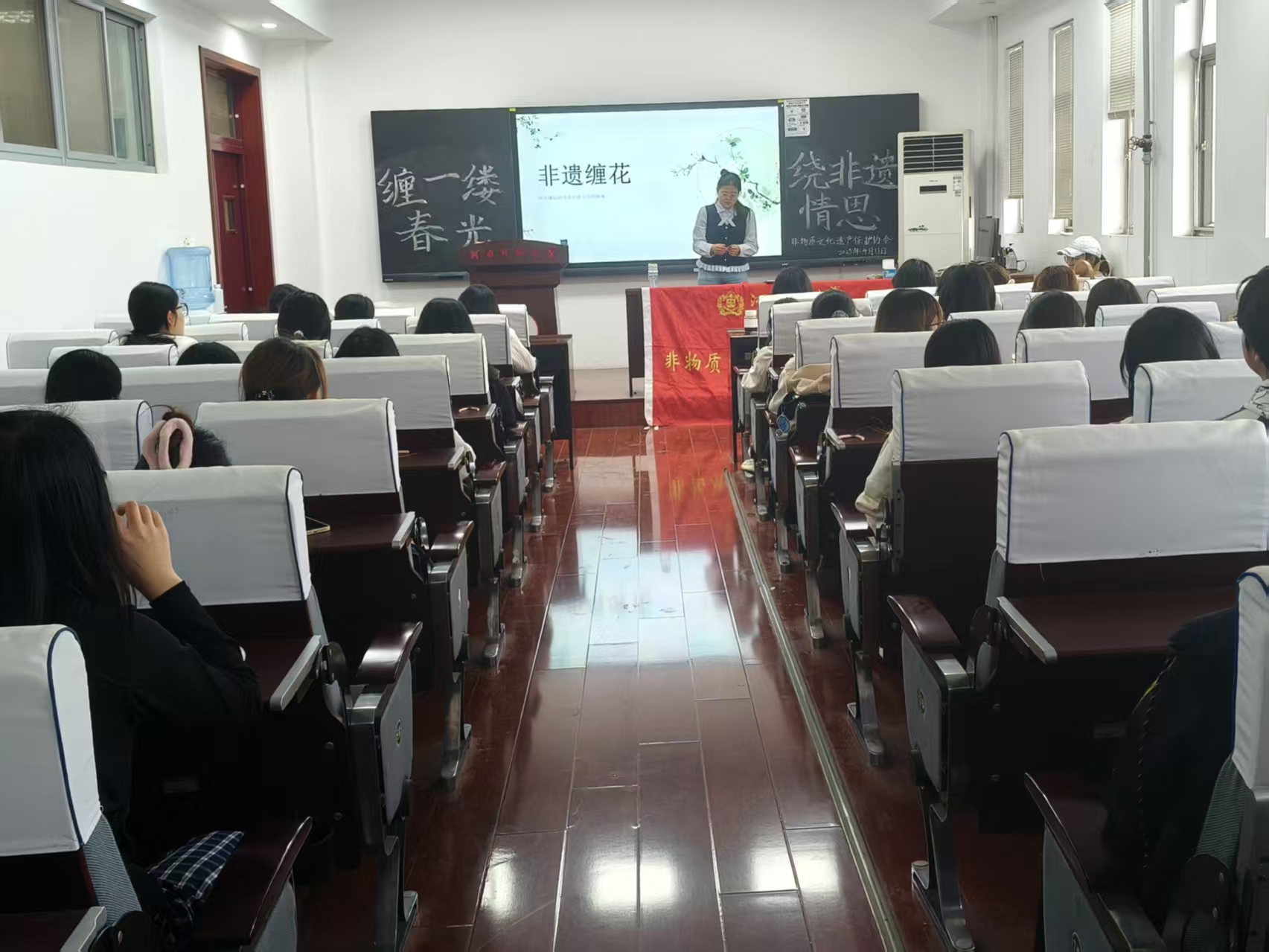 活动现场,主讲老师围绕缠花的历史渊源、文化寓意与制作工艺展开细致讲解,系统梳理了这项起源于明代、盛于清代的国家级非遗技艺的发展脉络,拆解了缠花“以蚕丝线为媒、铜丝为骨、纸胎为基”的核心工艺逻辑,从丝线选材、铜丝塑形到花瓣缠绕、整体拼接,一步步示范关键技法,手把手指导同学们规避制作误区。同学们认真聆听、动手实践,在一缠一绕、一折一捏间打磨细节感受传统手工艺的精致细腻,体悟非遗之美,在静心创作中陶冶情操、沉淀心境,有效践行了美育润心、文化铸魂的育人理念。