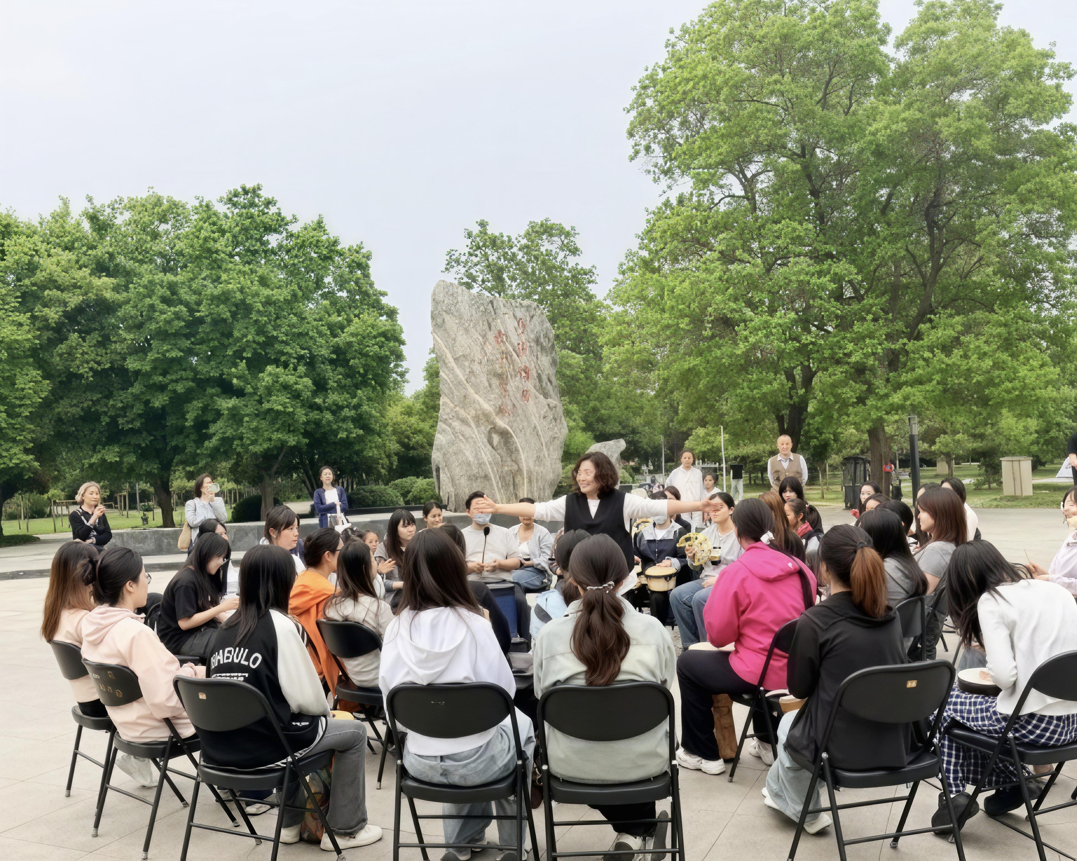 4月28日下午,音乐舞蹈学院“乐心筑梦”辅导员工作室在西校区中心花园内举办户外鼓圈减压活动。本次活动由音乐治疗专业教师吴潇、张睿婷担任引导,40余名师生参与其中。