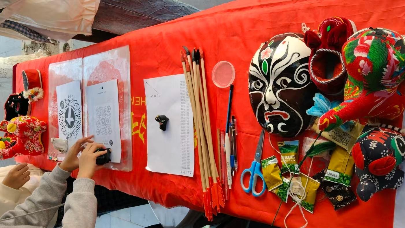 活动现场,志愿者们细致讲解投壶的历史渊源、礼仪规范与游戏规则,从“投壶为礼,寓教于乐”的文化内涵,到“连中”“贯耳”等趣味玩法,让大家感受古人“从容雅步、进退有度”的礼仪之美。一旁非遗展示区同步开放,铺着红布的长桌上陈列着剪纸、布艺玩偶、戏曲脸谱等精巧手作展品,色彩鲜亮,引得师生驻足观赏、拍照留念,近距离领略非遗匠心。在投壶体验区,师生们手持箭矢、屏气凝神瞄准壶口,在一次次投掷中感受传统游戏的乐趣,现场掌声与欢呼不断,氛围热烈雅致。不少同学表示,亲手体验投壶、观赏非遗展品,既解锁了古老游戏玩法,也读懂了藏在仪轨与器物里的文化底蕴,是一场生动的沉浸式美育课堂。