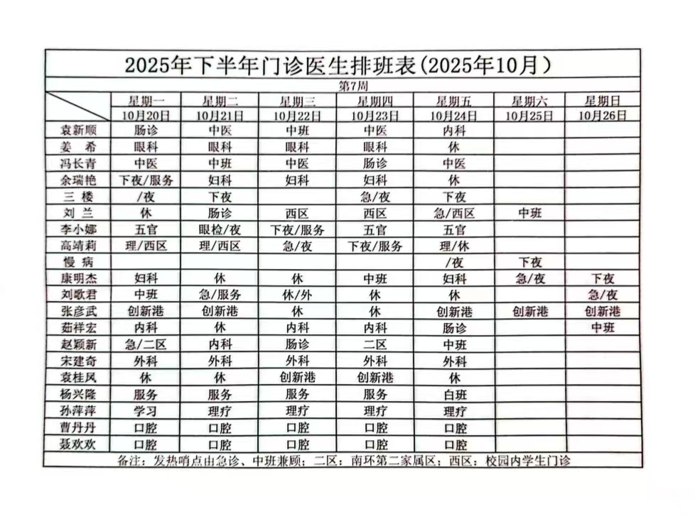 校医院门诊医生值班表(10.20--26)