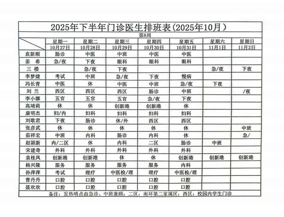校医院门诊医生值班表(10.27--11.2)