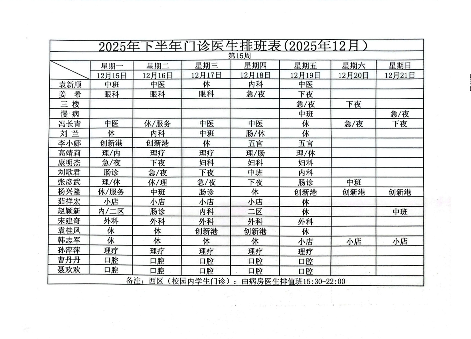 校医院门诊医生值班表(12.15--21)