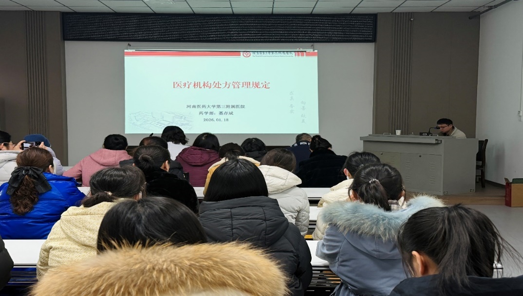 1月18日下午,校医院邀请河南医药大学第三附属医院药学部聂存斌老师为全院职工进行《医疗机构处方管理规定》培训并进行处方点评,提升我院处方规范化管理能力。培训会由副院长李玉周主持。