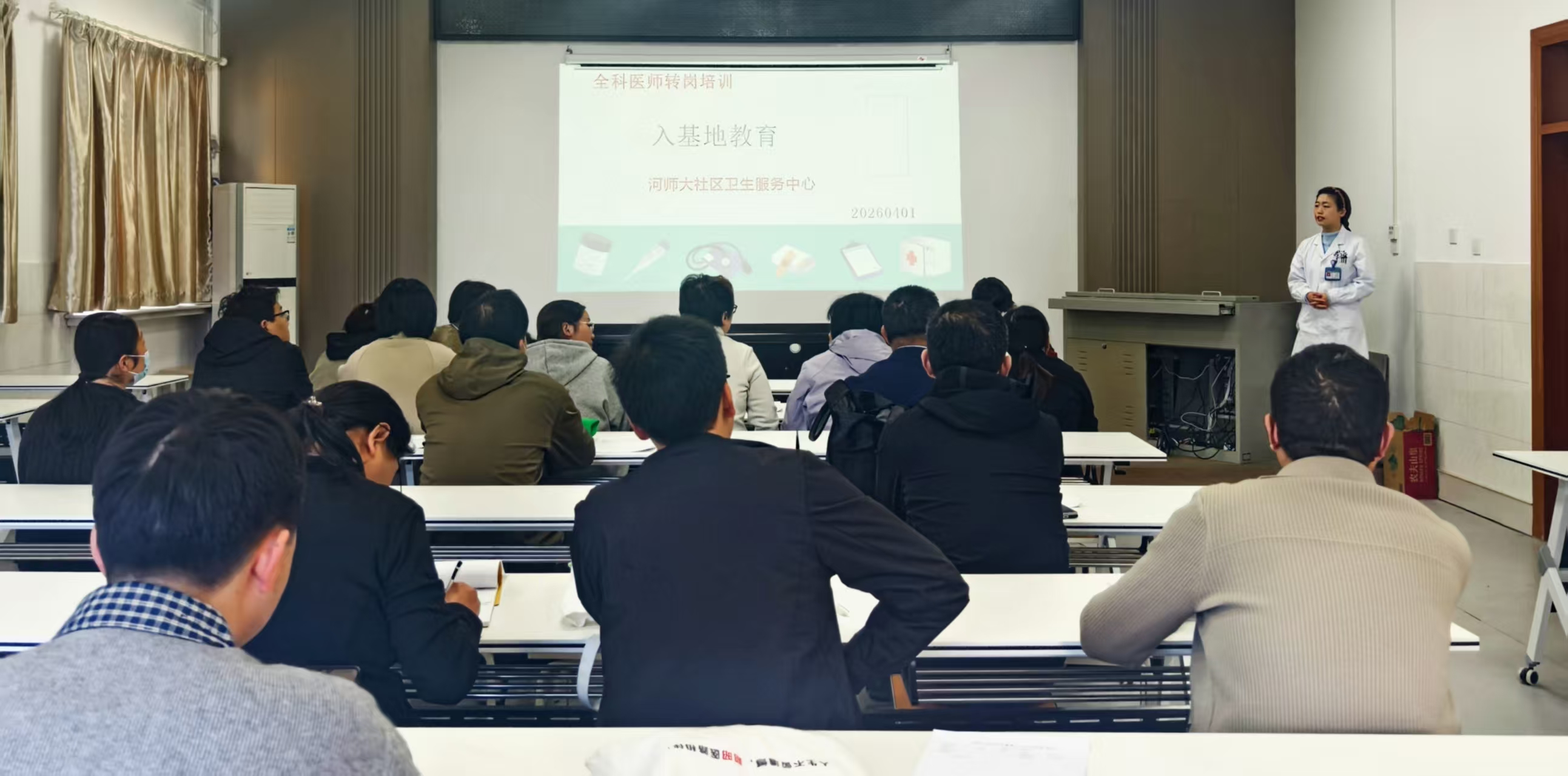 河师大社区卫生服务中心是新乡市第一人民医院、河南医药大学第三附属医院全科医师转岗培训基层医疗卫生实践培训基地,承担基层医疗卫生服务、基本公共卫生服务、基层医疗卫生管理服务带教工作。2026年4月1日中心为新乡市第一人民医院22名全科转岗医师进行基地入科培训。后续各转岗医师将在我中心进行为期1个月的基层转岗培训。