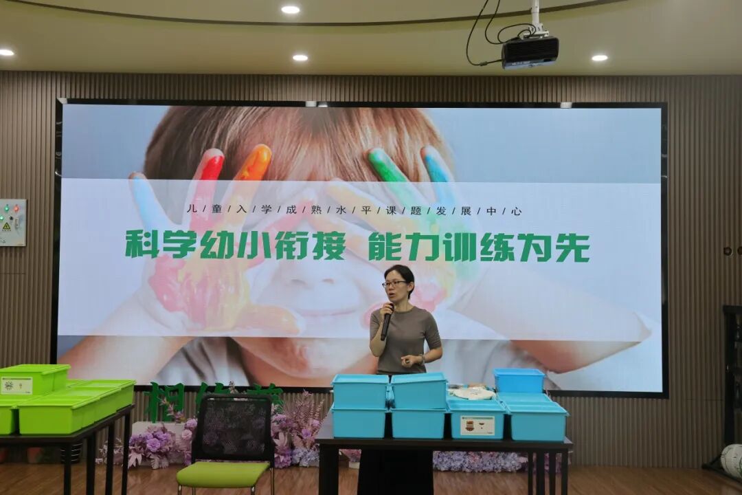 郭老师从当前幼小衔接的政策导向与儿童发展需求出发,强调“能力衔接”而非“知识抢跑”,指出科学的幼小衔接应聚焦儿童身心准备、学习能力及社会适应能力的全面发展。围绕“入学成熟水平”理论,郭老师详细剖析了儿童入学所需的八大核心能力,包括视知觉、听知觉、运动协调、语言沟通、数学准备、社会适应、学习品质等,结合生动案例详细说明。针对幼儿园实操环节,现场演示了“能力训练区”的创设与运用,指导教师通过游戏化、情境化的材料设计,帮助幼儿在互动中自然学习提升技能。为支持教师持续学习,推荐线上评估工具与教学资源平台,助力园所实现“家园校”协同共育。