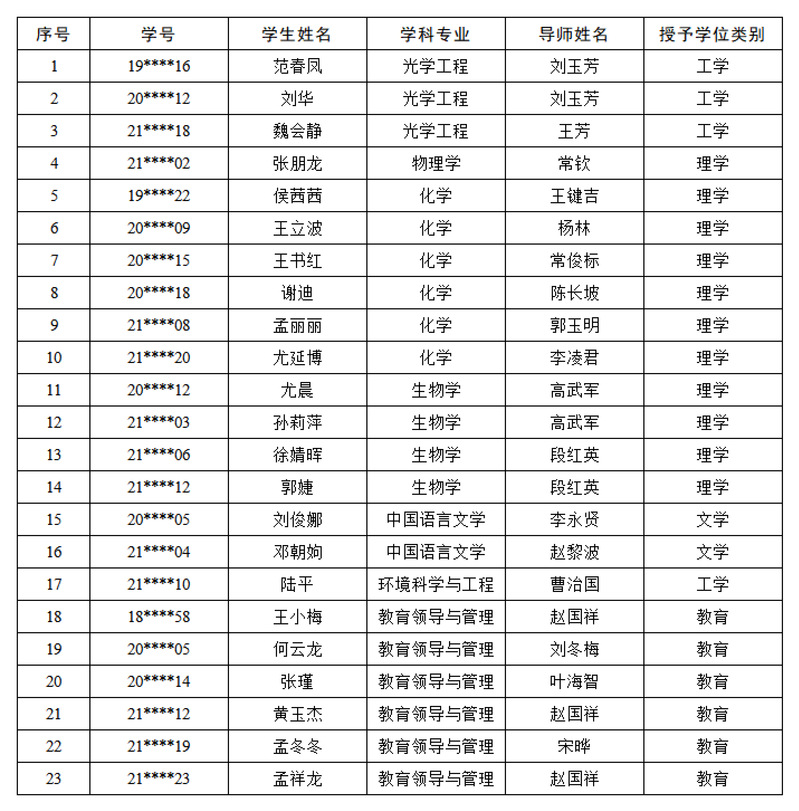 根据《中华人民共和国学位》和《河南师范大学硕士、博士学位授予工作细则》等法律文件规定,经学院部)学位评定分委员会审议、校学位评定委员会审定,决定授予范春凤等23名博士研究生博士学位,现将名单公示如下: