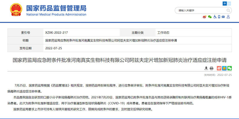 阿兹夫定片是我国自主研发的口服小分子新冠病毒肺炎治疗药物。2021年7月20日,国家药监局已附条件批准本品与其他逆转录酶抑制剂联用治疗高病毒载量的成年HIV-1感染患者。此次为附条件批准新增适应症,用于治疗普通型新型冠状病毒肺炎(COVID-19)成年患者。国家药监局要求上市许可持有人继续开展相关研究工作,限期完成附条件的要求,及时提交后续研究结果。