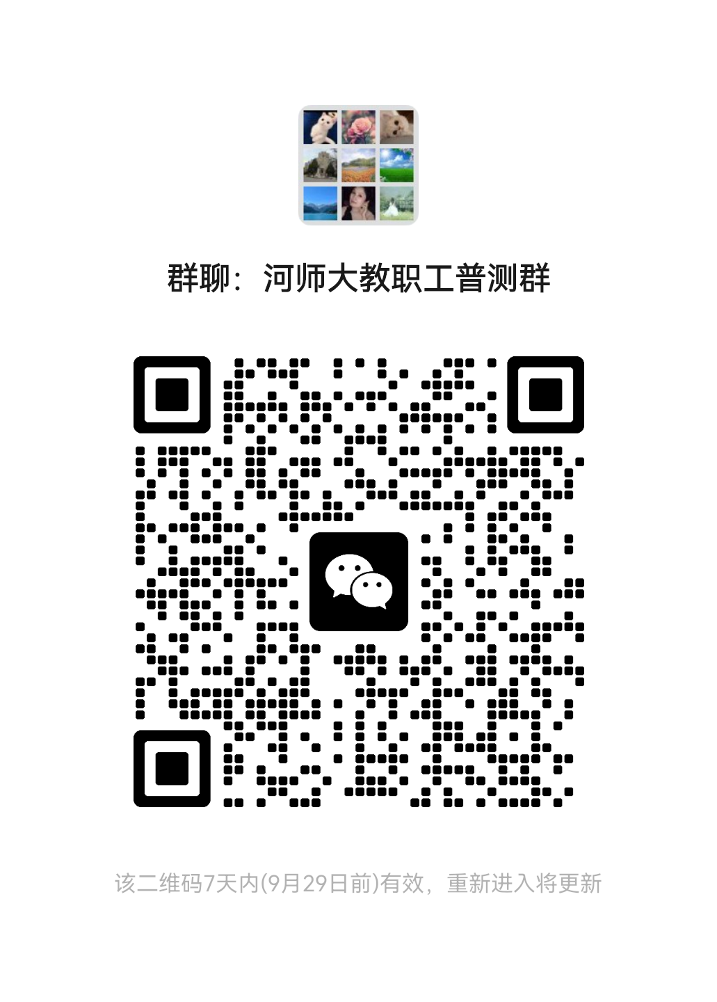 在校教职工 请自行加入微信群“河师大教职工普测群”;按通知在群内完善个人信息,并通知有关考试事项,非本校教职工请勿入群。