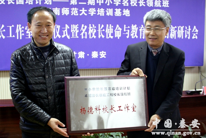 11月10日,秦安县杨德科校长工作室授牌仪式在县兴国三小举行。国家教育行政学院远程培训中心副主任、教育部中小学校(园)长国家级培训项目管理办公室副主任于维涛,河南师大教育学院院长、博士生导师宋晔,西北师大教育学院副院长李泽林,秦安县人大常委会副主任张耀清,县教体局相关负责人、工作室成员及县骨干校长、骨干教师代表参加了授牌仪式。